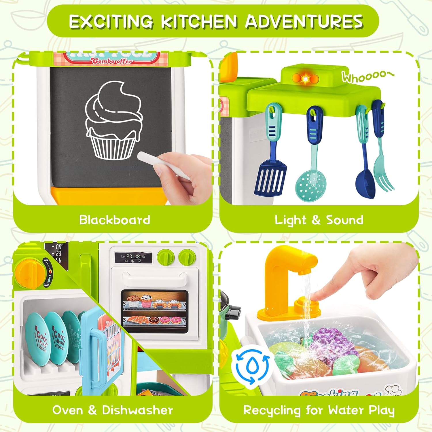 - Licht, Sound & Dampf: Der Herd bietet realistische Licht- und Kochgeräusche sowie echten Dampf, aktiviert durch Drehen eines speziellen Knopfes. (Vor Gebrauch Wasser in den Dampfauslass einfüllen.) Selbst die Dunstabzugshaube leuchtet und brummt wie