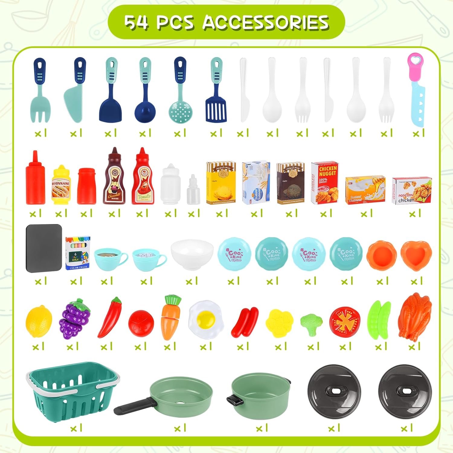 - 54-teiliges Zubehörset: Enthält schneidbares Obst & Gemüse, Töpfe, Pfannen, Geschirr, Besteck, Lebensmitteldosen, Kreidetafel & Aufbewahrungskorb, ideal für realistisches Rollenspiel! Fördert Kreativität, Feinmotorik & Vorstellungskraft.