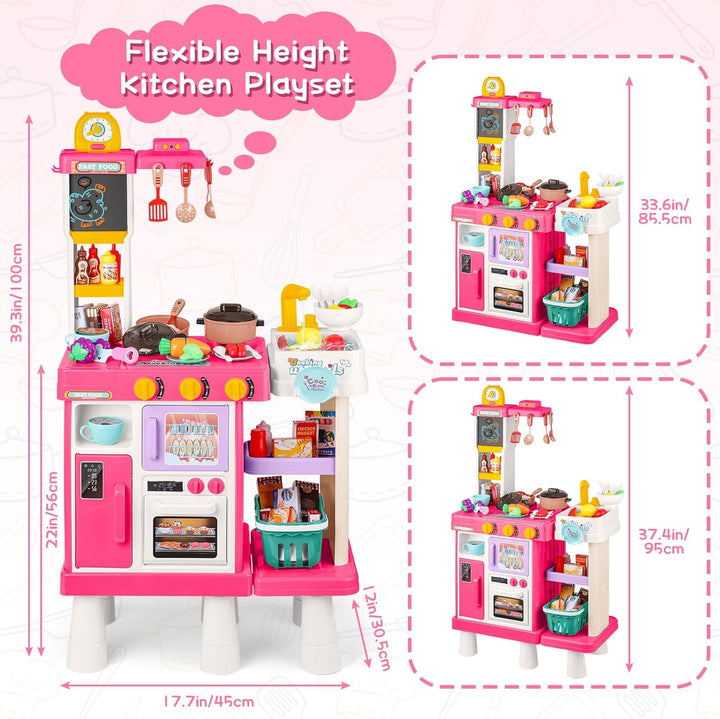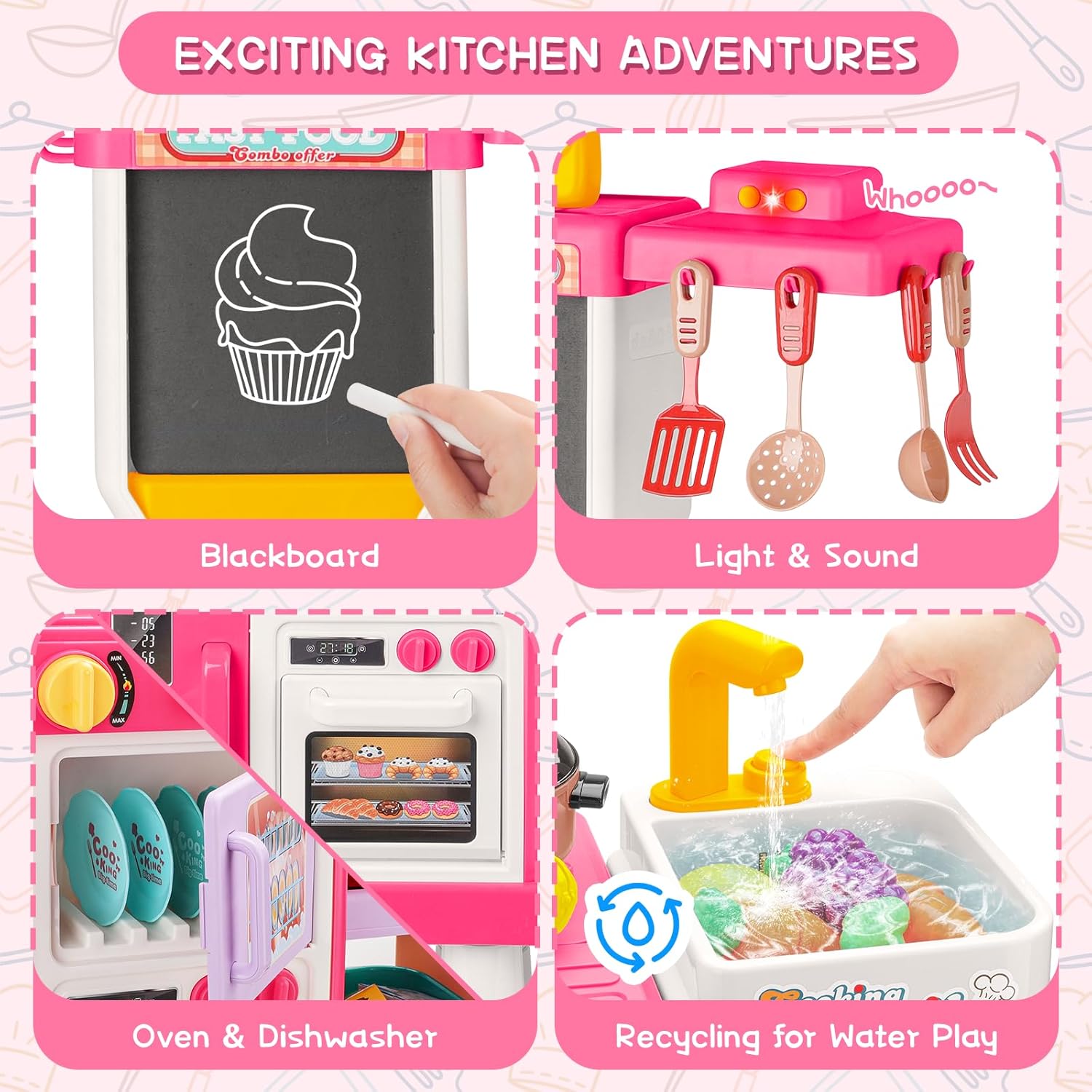 - Licht, Sound & Dampf: Der Herd bietet realistische Licht- und Kochgeräusche sowie echten Dampf, aktiviert durch Drehen eines speziellen Knopfes. (Vor Gebrauch Wasser in den Dampfauslass einfüllen.) Selbst die Dunstabzugshaube leuchtet und brummt wie