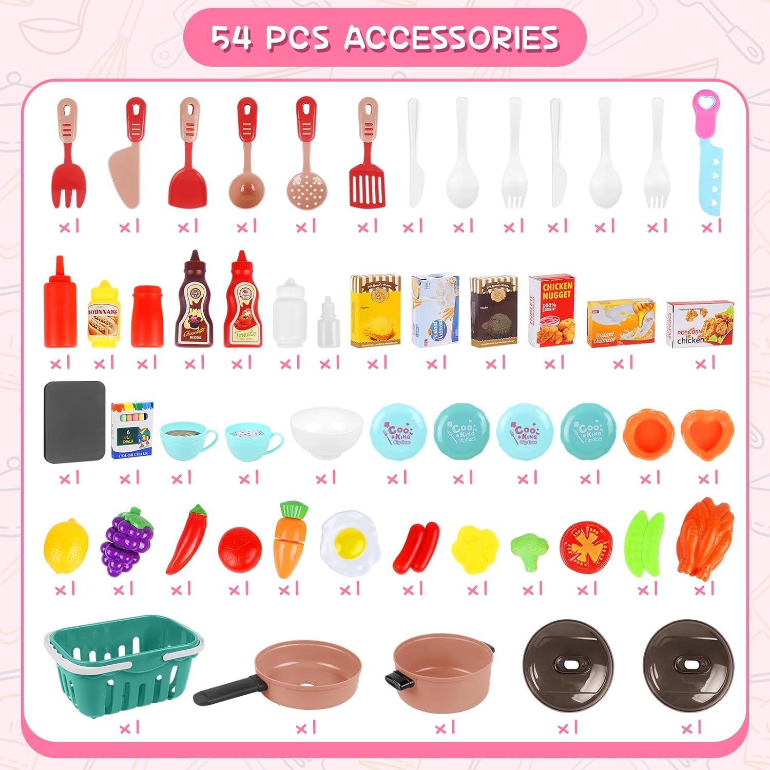 - 54-teiliges Zubehörset: Enthält schneidbares Obst & Gemüse, Töpfe, Pfannen, Geschirr, Besteck, Lebensmitteldosen, Kreidetafel & Aufbewahrungskorb, ideal für realistisches Rollenspiel! Fördert Kreativität, Feinmotorik & Vorstellungskraft.