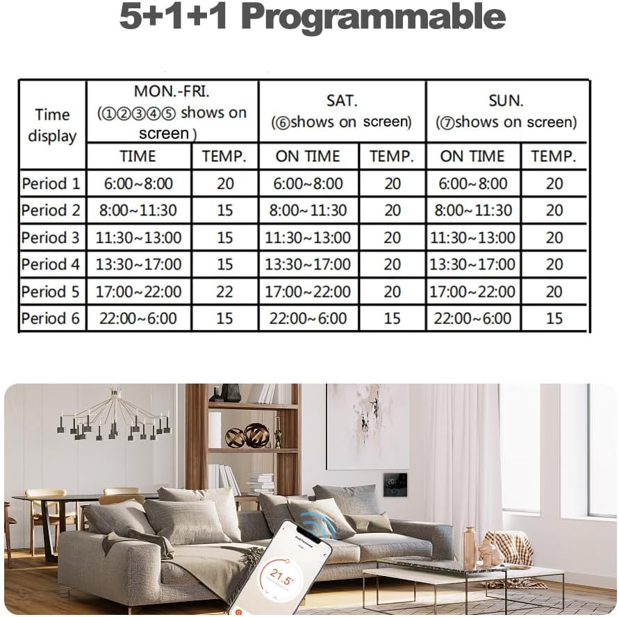 - WÖCHENTLICHE PROGRAMMIERBARE FUNKTION: Dieser intelligente Thermostat mit LED-Anzeige bietet eine wöchentliche 5+1+1-Programmierung, mit der Sie jeden Tag bis zu sechs verschiedene Zeitintervalle planen können. Es verbessert die Energieeffizienz,