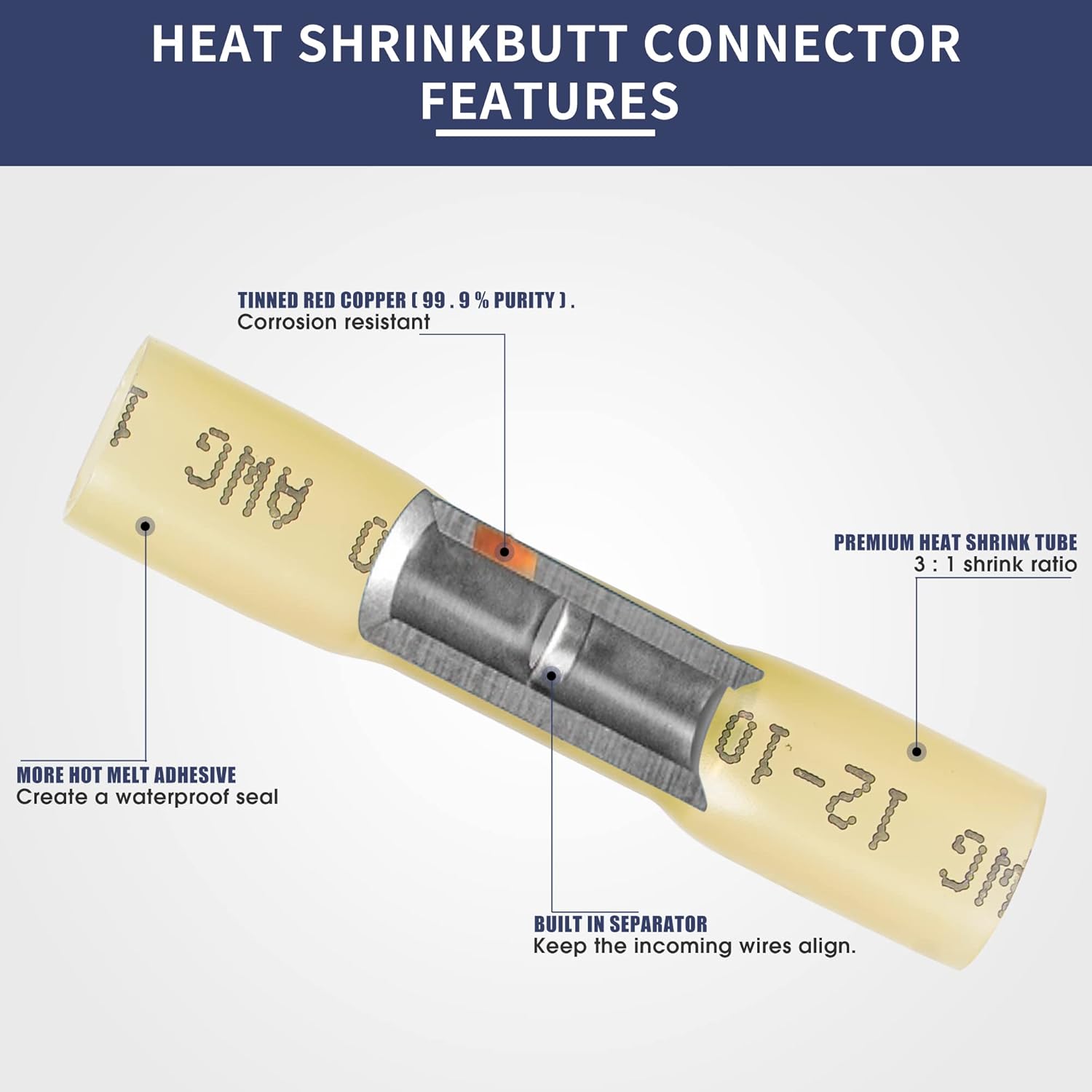 - 【Innere Eigenschaften von Schrumpfverbindern】 Das Innere enthält heisses Sol, das sich beim Schrumpfen verfestigt und schmilzt, wodurch die Drähte fest umwickelt und undurchlässig versiegelt werden. Reine Kupferanschlüsse sorgen für höchsten