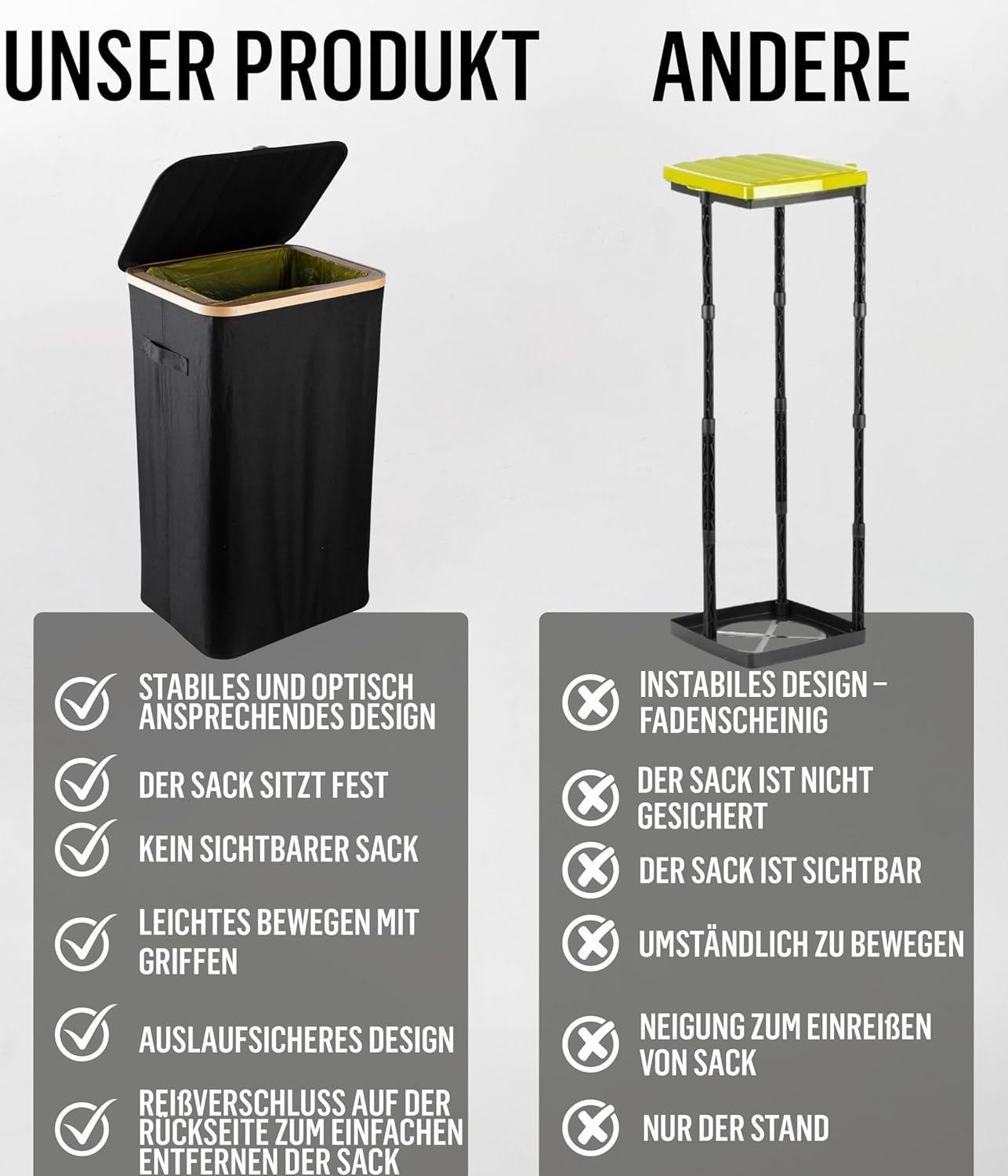 - INTELLIGENTES DECKELDESIGN – Der natürliche Bambusrahmen mit verstärktem Metallring hält den Recyclingbeutel sicher in Position und verhindert ein Durchhängen. Der Stoffbezug verdeckt den Abfall und reduziert unangenehme Gerüche.