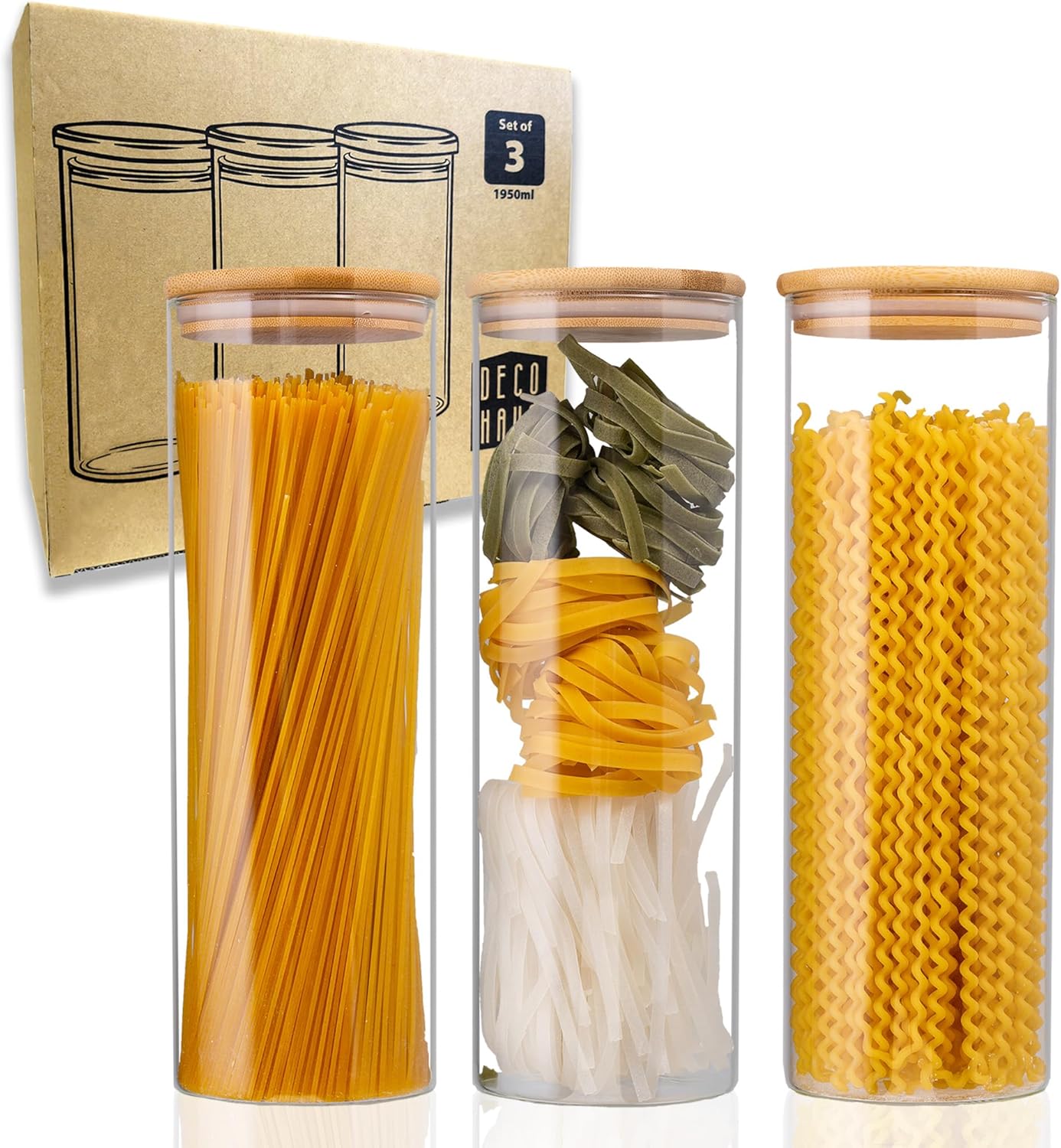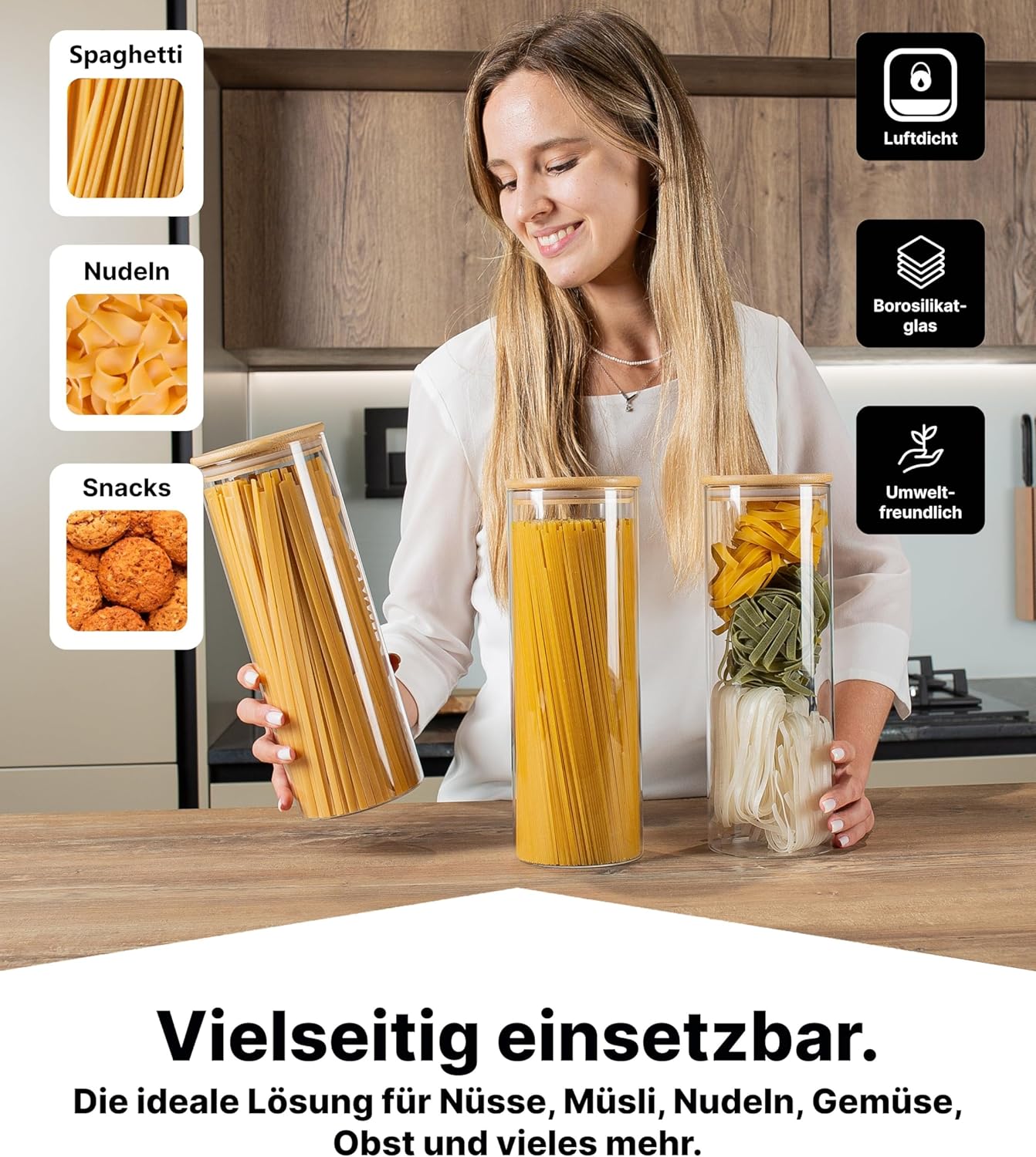 - LEBENSMITTELECHT - Unsere Glasbehälter bestehen aus hochwertigem Borosilikatglas, die Deckel sind aus Bambus mit Dichtung – zum Aufbewahren Mehl, Müsli, Cornflakes, Zucker, Nudeln, Spaghetti