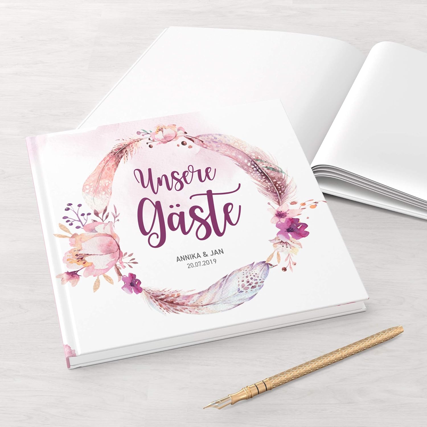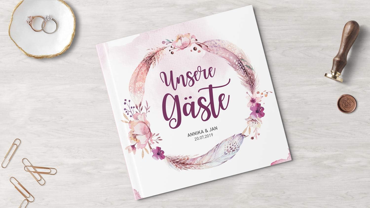 - ✅ PERSONALISIERT: Das Gästebuch wird mit Namen und Datum personalisiert. Die Schriftart, Schriftfarbe und das Layout entspricht den Produktbildern. Die Daten zur Personalisierung werden im Bestellprozess übermittelt.