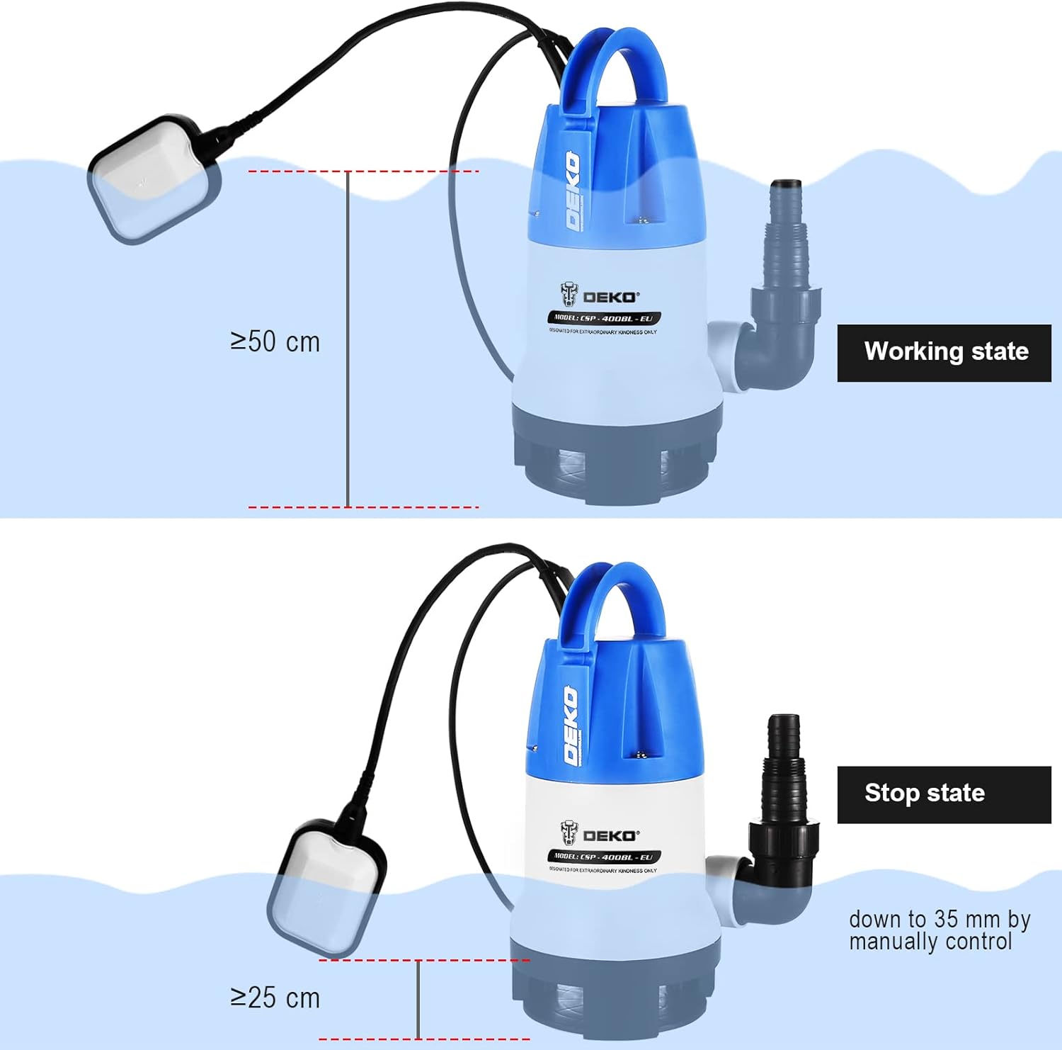 - [LEISTUNGSFÄHIGE LEISTUNG] Beste Leistung. Der Abfluss beträgt 8000 l / h. Die Pumpenhöhe beträgt bis zu 5 m. Die Eintauchtiefe der Gartenpumpe beträgt 7 m, wodurch das Abwasser leicht abgeleitet werden kann. Diese Tauchwasserpumpe fördert