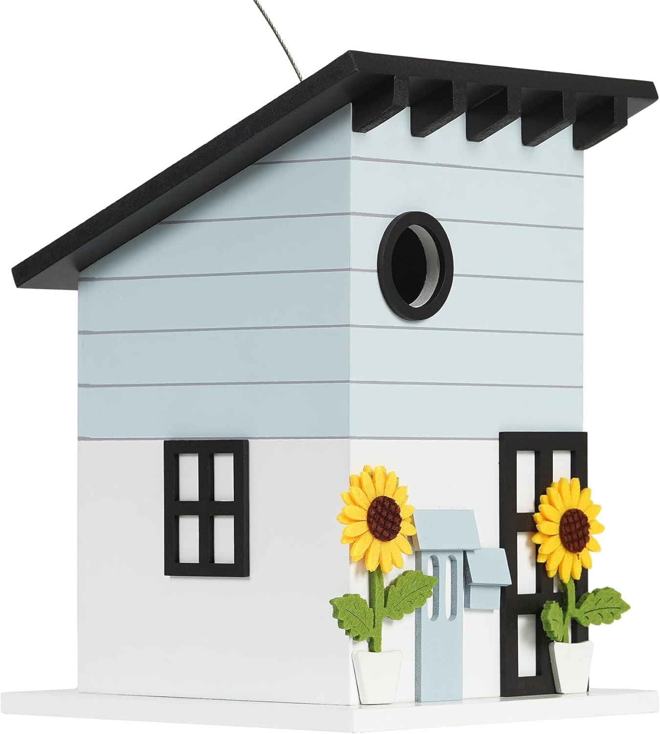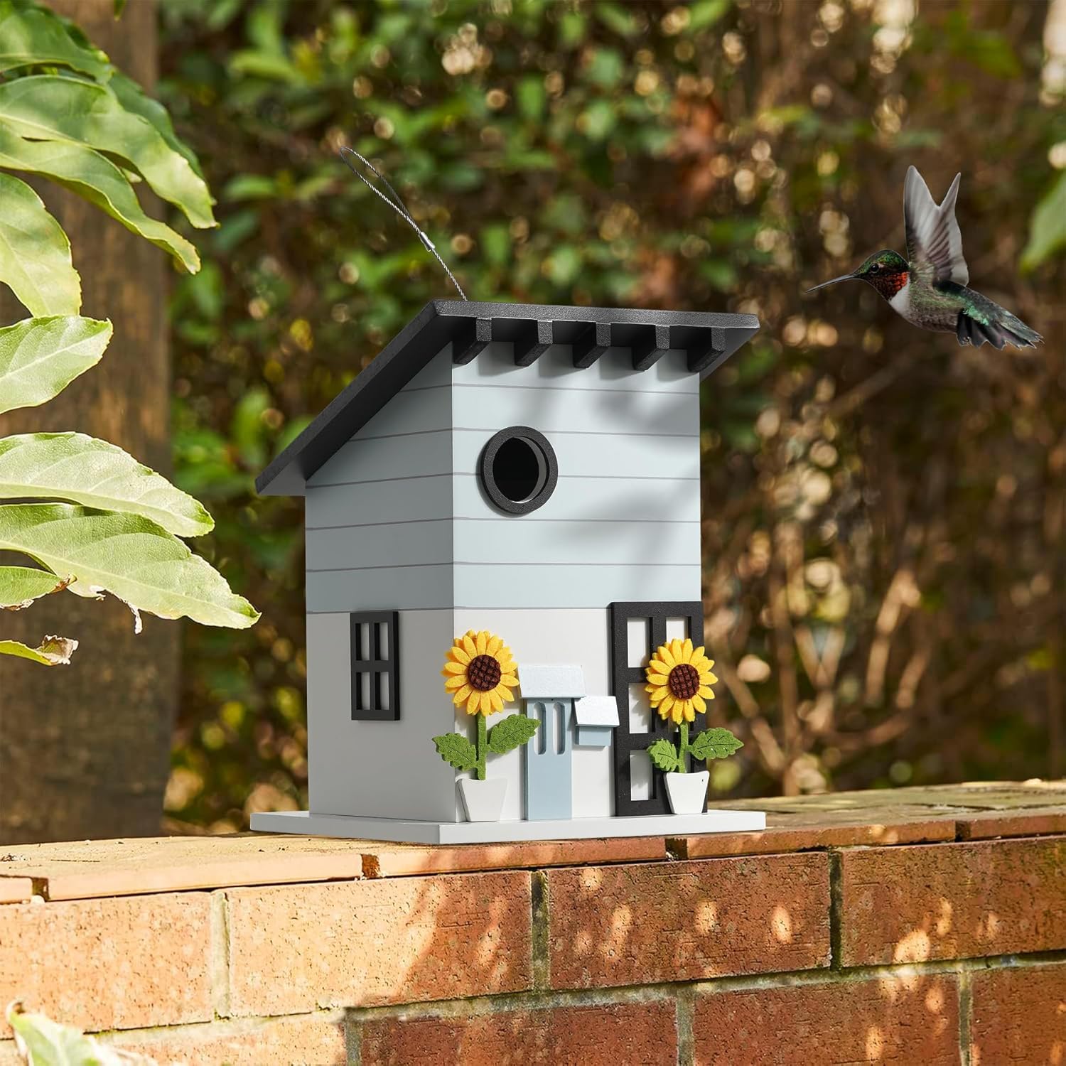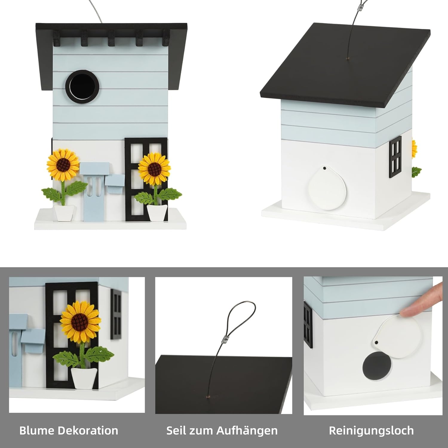 - DEKORATIVES VOGELKÄSTCHEN: Das exquisite Bird Nest (HBT: 24x17,5x17,5cm) sieht aus wie ein kleines Gartenhäuschen und ist mit seinem hübschen gelben Sonnenblumen-Dekor ein besonderer Blickfang. Die Vogelvilla eignet sich sowohl für den Aussenbereich