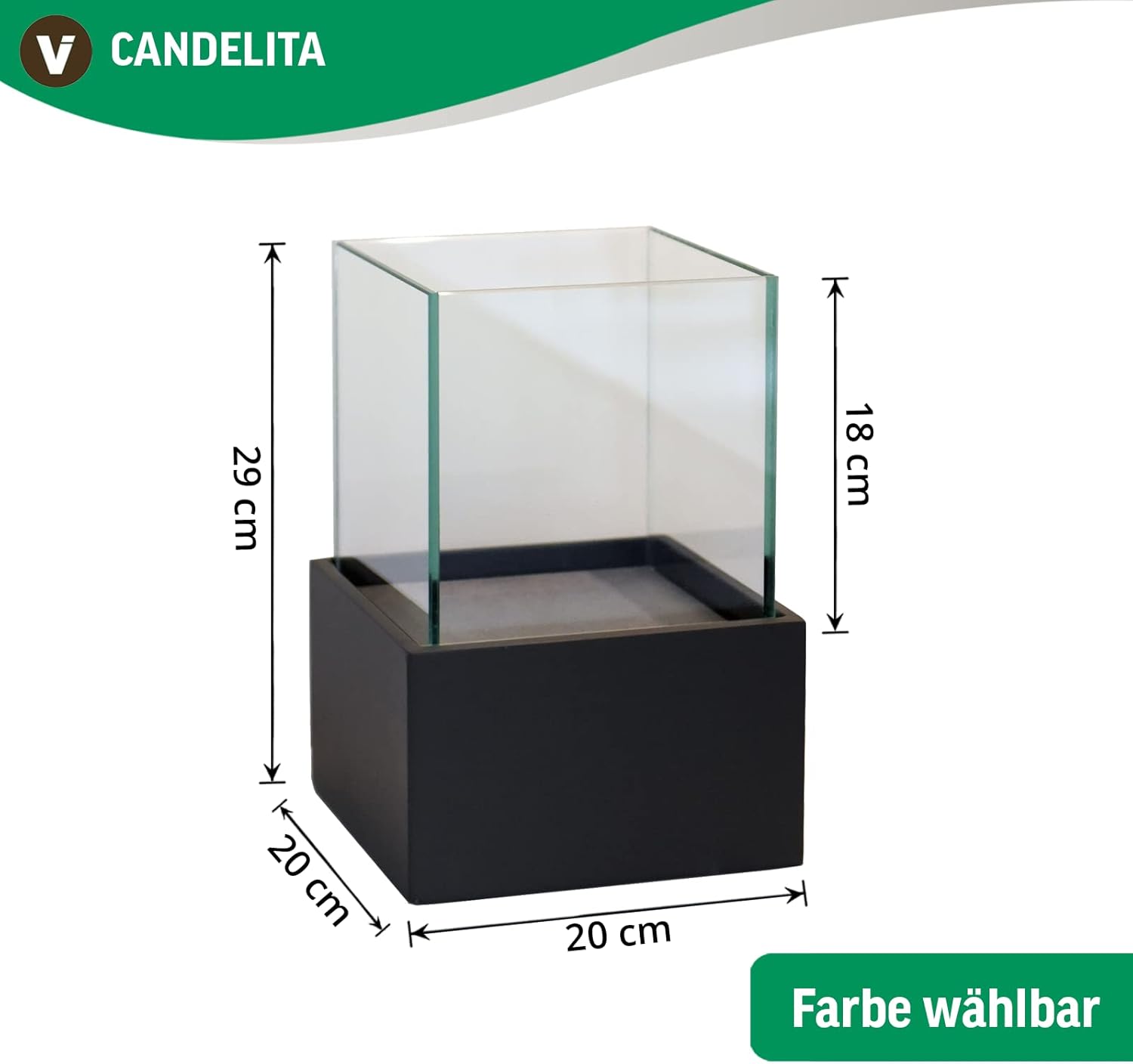 • Grösse (Höhe x Breite x Tiefe): 29 x 20 x 20 cm - Masse Glasaufsatz: 18x17x17 cm - Höhe Unterkonstruktion: 12 cm