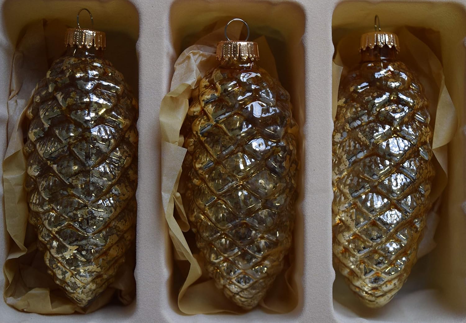 Dekohelden24 Lauschaer Christbaumschmuck - 9er Set, Zapfen - Eicheln - Walnüsse, 8 cm in Gold mit go