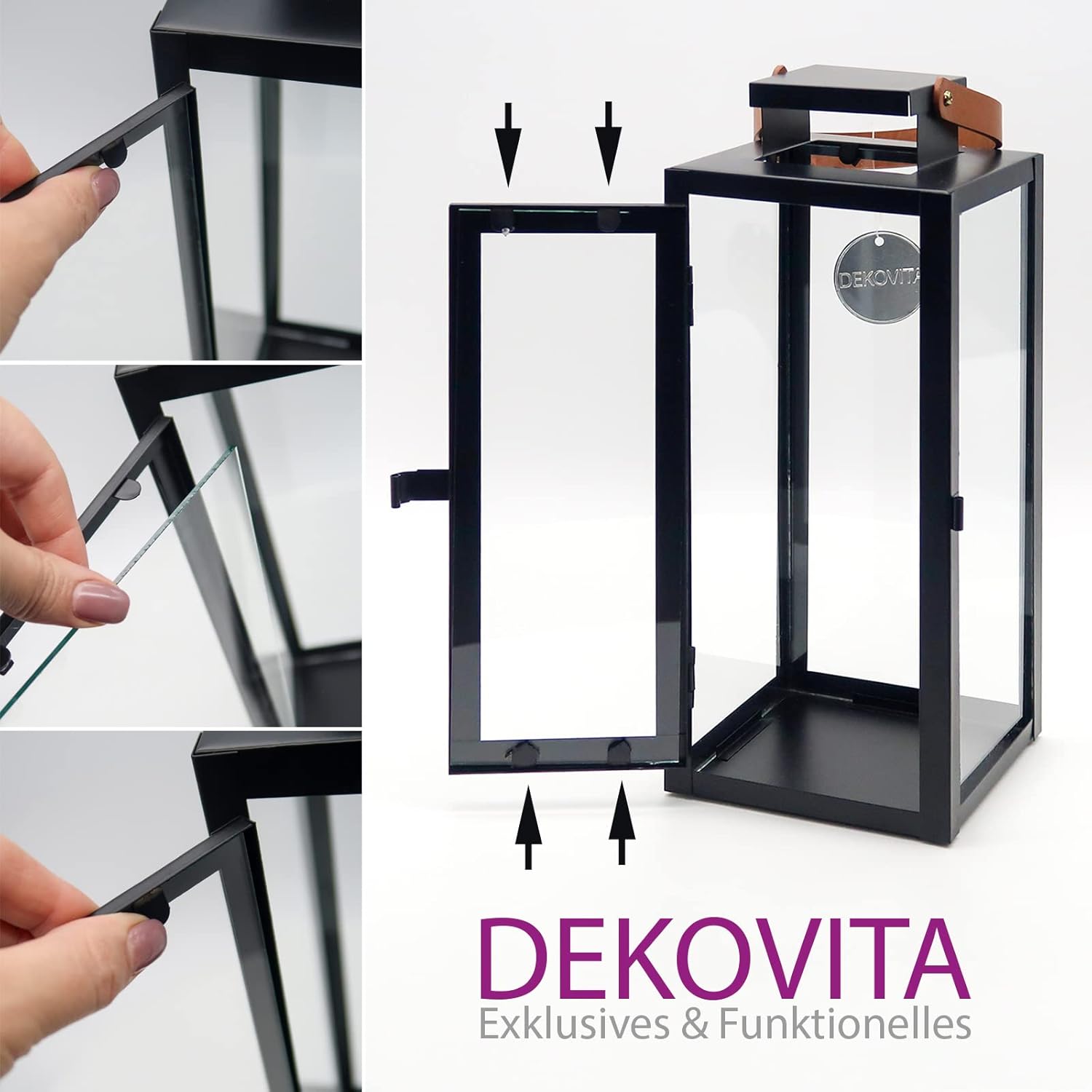 - HANDGEFERTIGT MIT ECHTGLAS-SCHEIBEN: Die stillvolle Metall-Laterne in mattem Schwarz 12,5x12,5x30 cm ist ein handgefertigtes Unikat. Die Scheiben sind aus echtem Glas, die man zum Gravieren herausnehmen und wieder einsetzen kann.