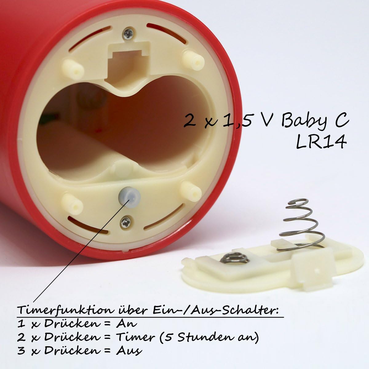 • LANGE BRENNDAUER - Bei Betrieb mit 2 Alkaline Batterien Typ C 1,5V (optional), werden Leuchtzeiten bis zu 400 STUNDEN erreicht. Das bedeutet eine Laufzeit in der Timerfunktion bis zu 80 TAGEN!
