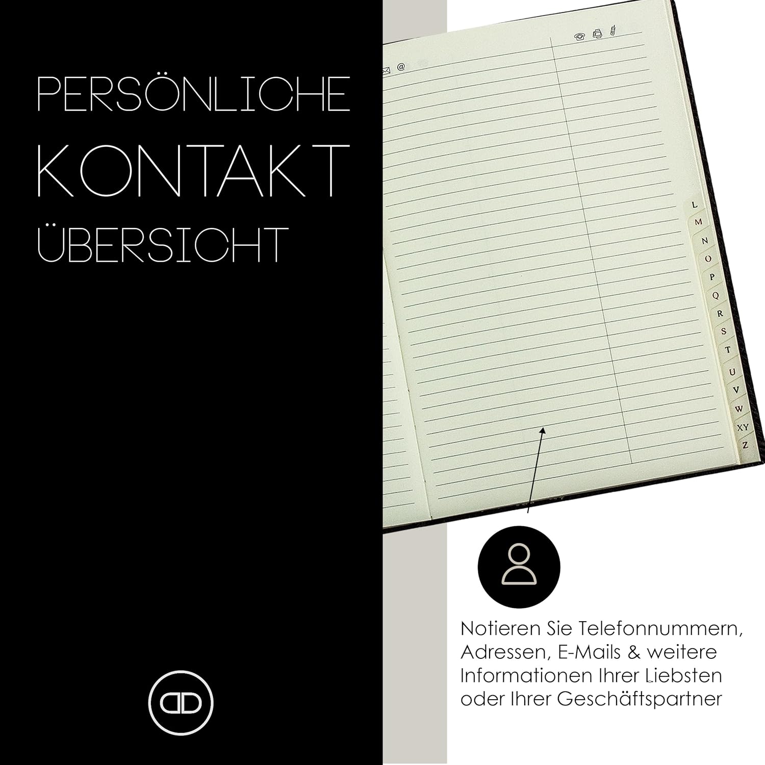 - VIELSEITIG – Das in Echtleder eingebundene Adressbuch im DIN A5 Format, welches mit einem plastifizierten Tabenregister von A bis Z ausgestattet ist und aus 96 Seiten cremefarbenen, liniertem Papier (110 g/m²) besteht, ermöglicht es Ihnen, die