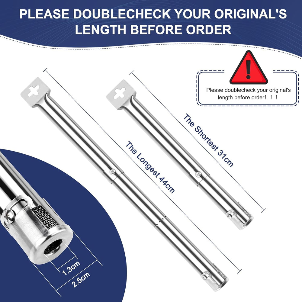 - 【ABMESSUNGEN】 - Brenner erstreckt sich von 31 cm bis 44 cm. Innendurchmesser: 1,3cm, Aussendurchmesser: 2,5cm. Verstellbar von 30 cm bis 72 cm in der Länge; Breite 9,5 cm; Crossover Schläuche auf 19,1 cm. Passend für Brinkmann Gasgrill 4 Brenner