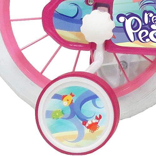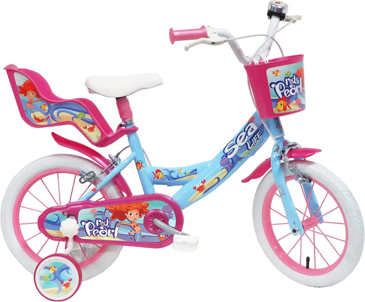 - Mädchenfahrrad für 4 bis 6 Jahre, Modell Sea L, mit Korb vorne, Puppenhalter hinten und Klingel, hellblau, fuchsia und weiss