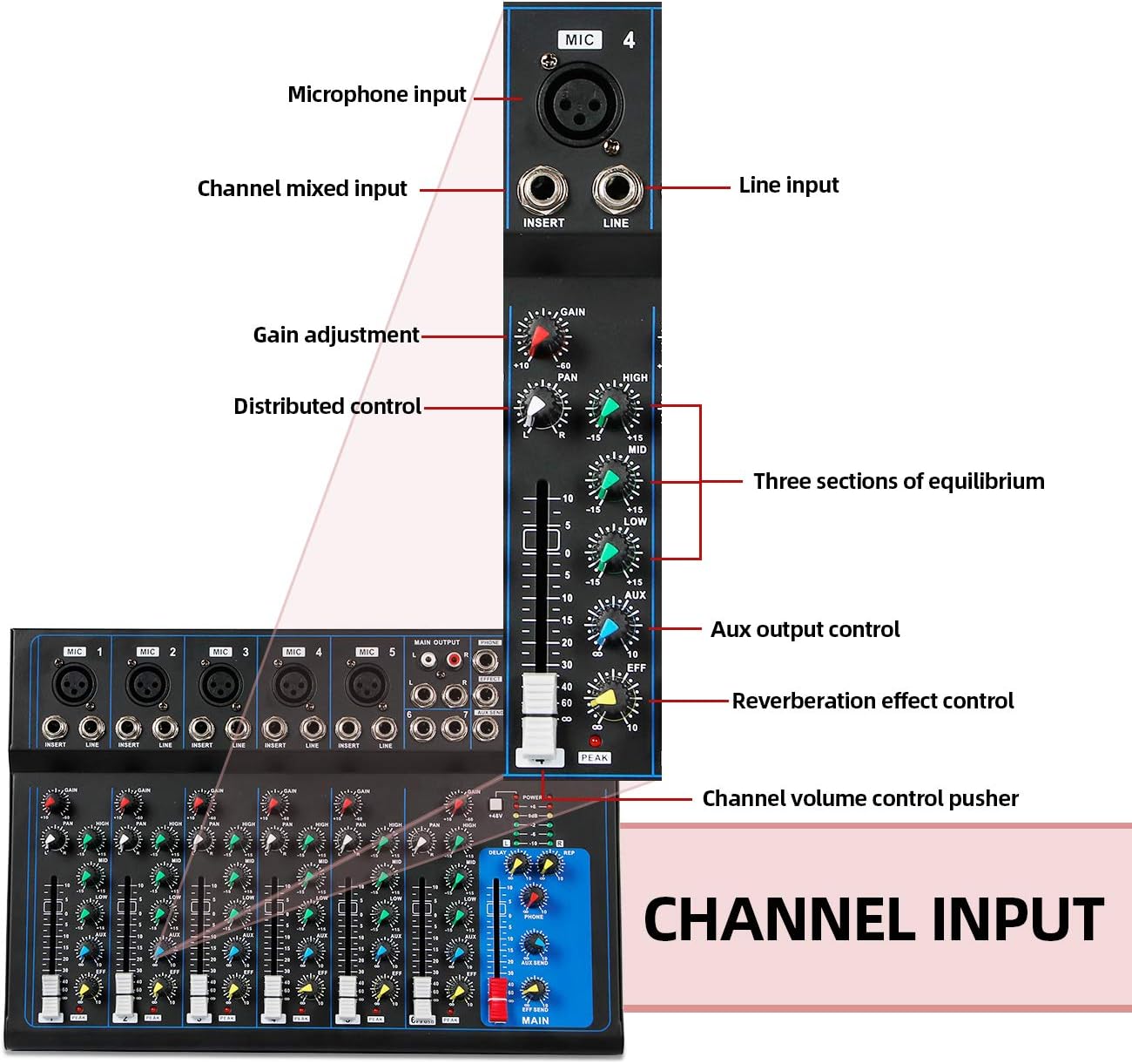 - This is new 7-channel Bluetooth mixer, built-in wireless Bluetooth, DSP reverberation effect, 3-band equalization adjustment, comes with USB interface, support U disk playback function.