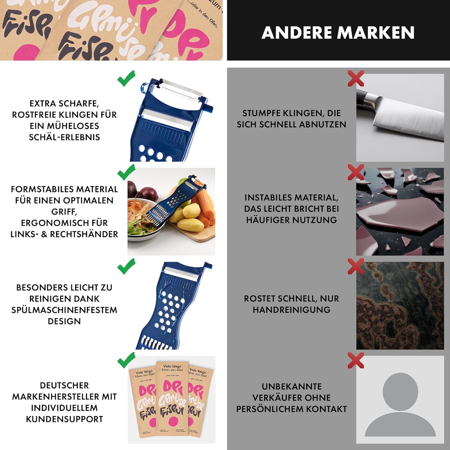 - PRÄZISE KLINGE: Die scharfen Klingen ermöglichen gleichmässiges und effizientes Schälen verschiedener Lebensmittel