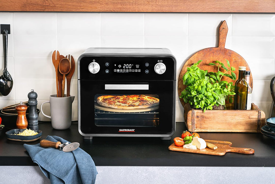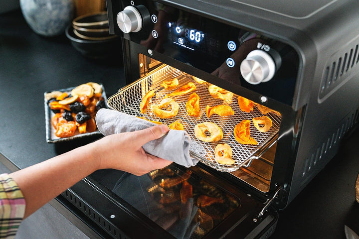 - 5 in 1: Pizzaofen, Heissluftfritteuse, Mini-Backofen, Grill-Drehspiess und Dörrgerät