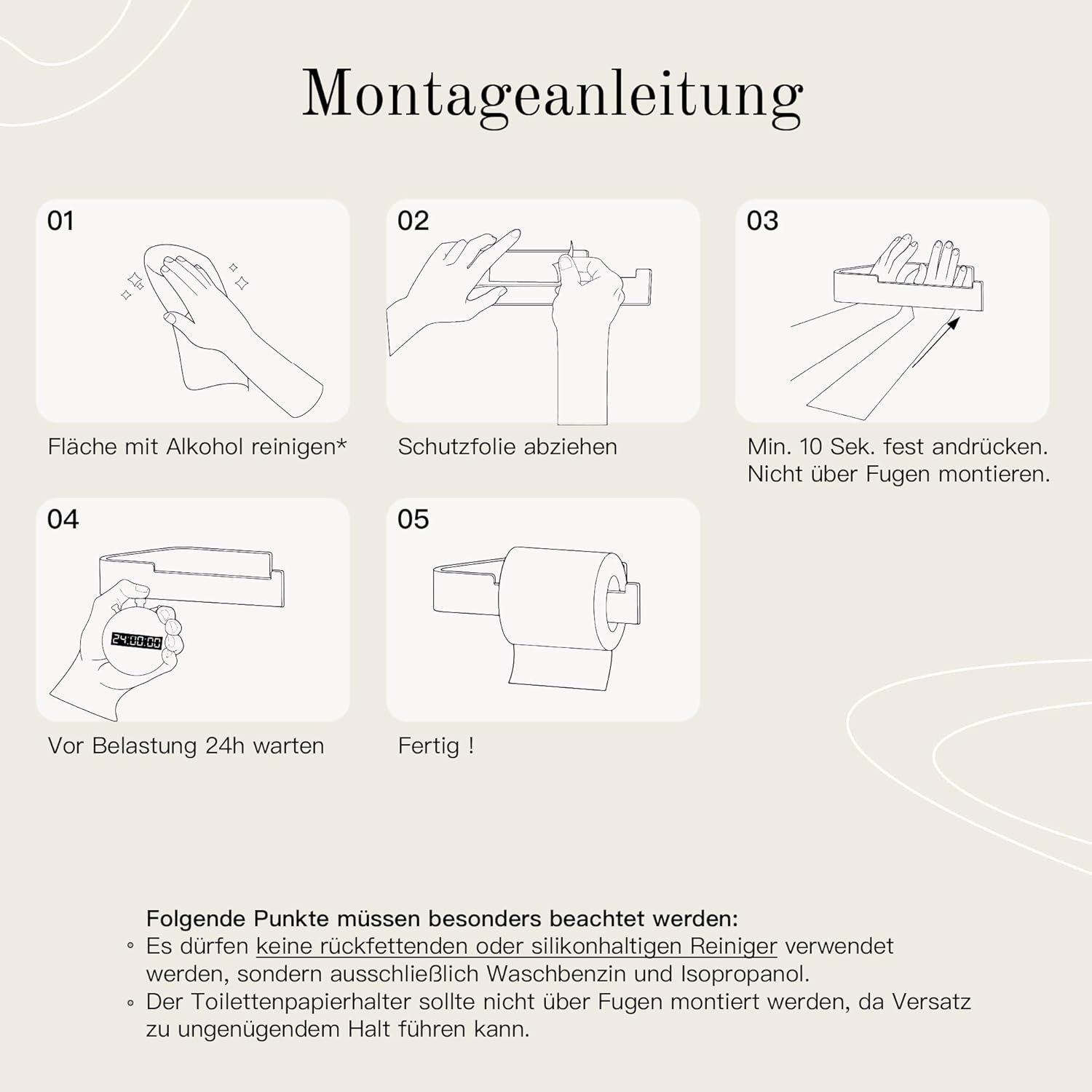 - ☑️ Einfache Montage und bombenfester Halt. Den Klopapierhalter ohne Bohren montierst du mit dem beiliegenden Markenklebeband ganz ohne Bohren und ohne Werkzeug an Wand und Badaccessoires.