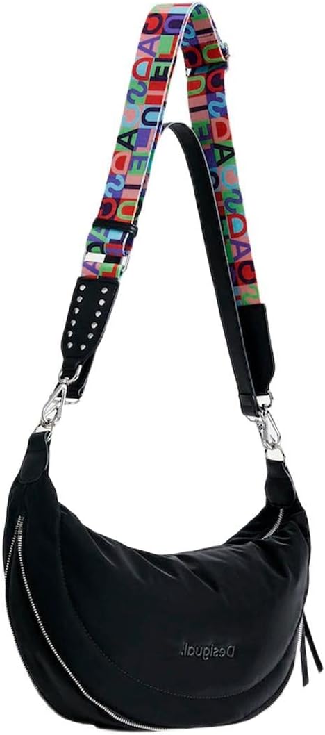 PRODUKTBESCHREIBUNGEN Weiche, vielseitige Umhängetasche aus Steppstoff in Form einer Banane. Mit mehreren Henkeln, daunter ein langer Riemen mit bunten Buchstaben und ein kurzer, einfarbiger Henkel. Innenfutter mit Messages der Kollektion.