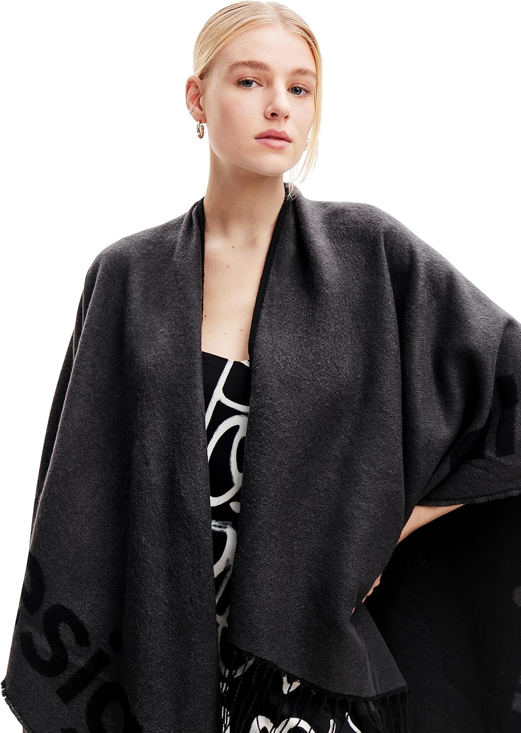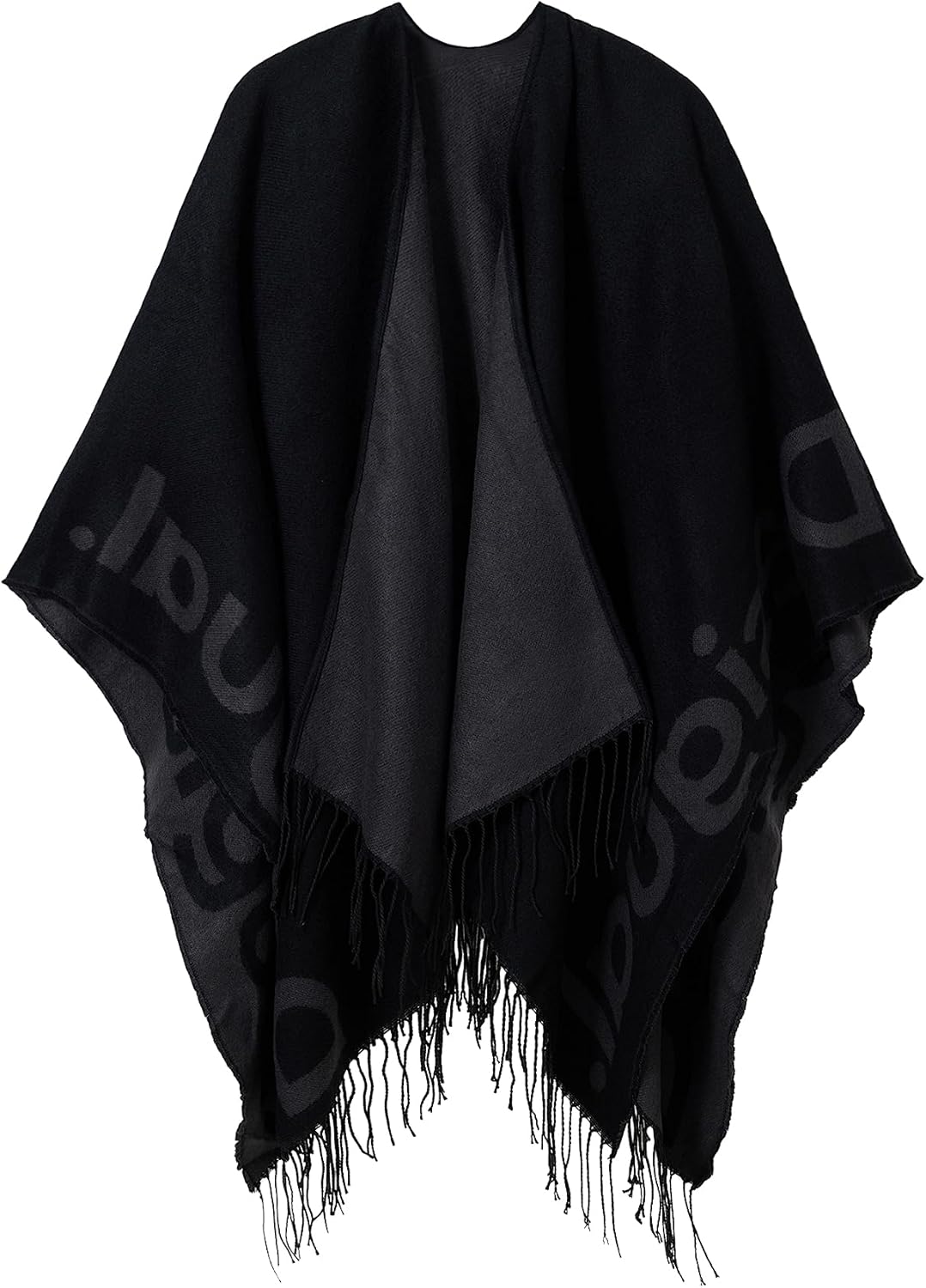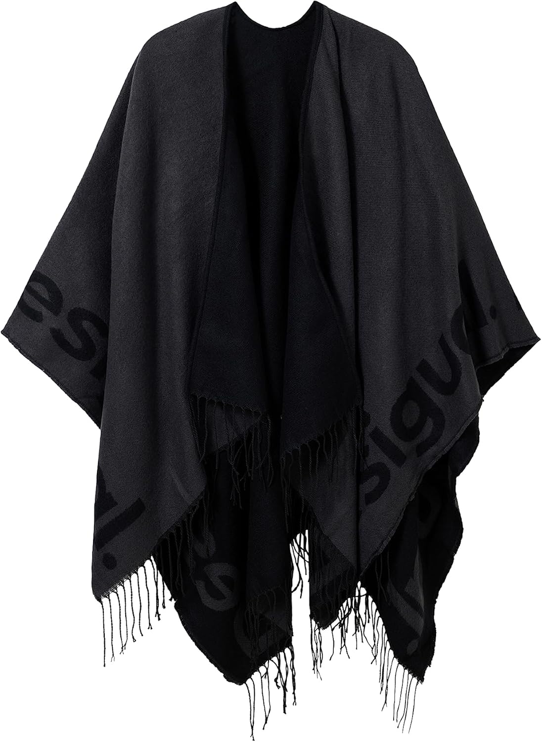 PRODUKTBESCHREIBUNGEN Offener, beidseitig tragbarer Oversize-Poncho aus zweifarbigem Stoff mit kontrastierendem Logo und Fransen am Saum.
