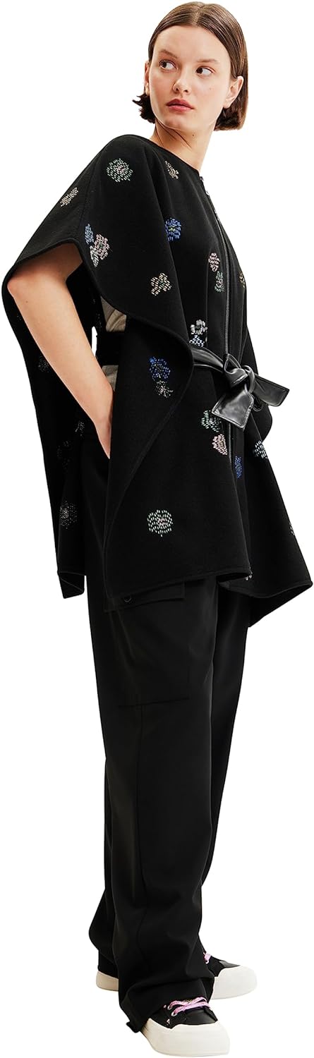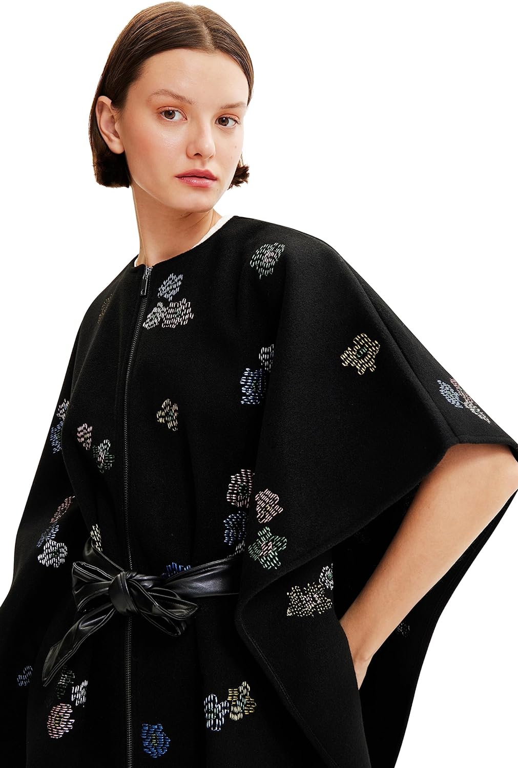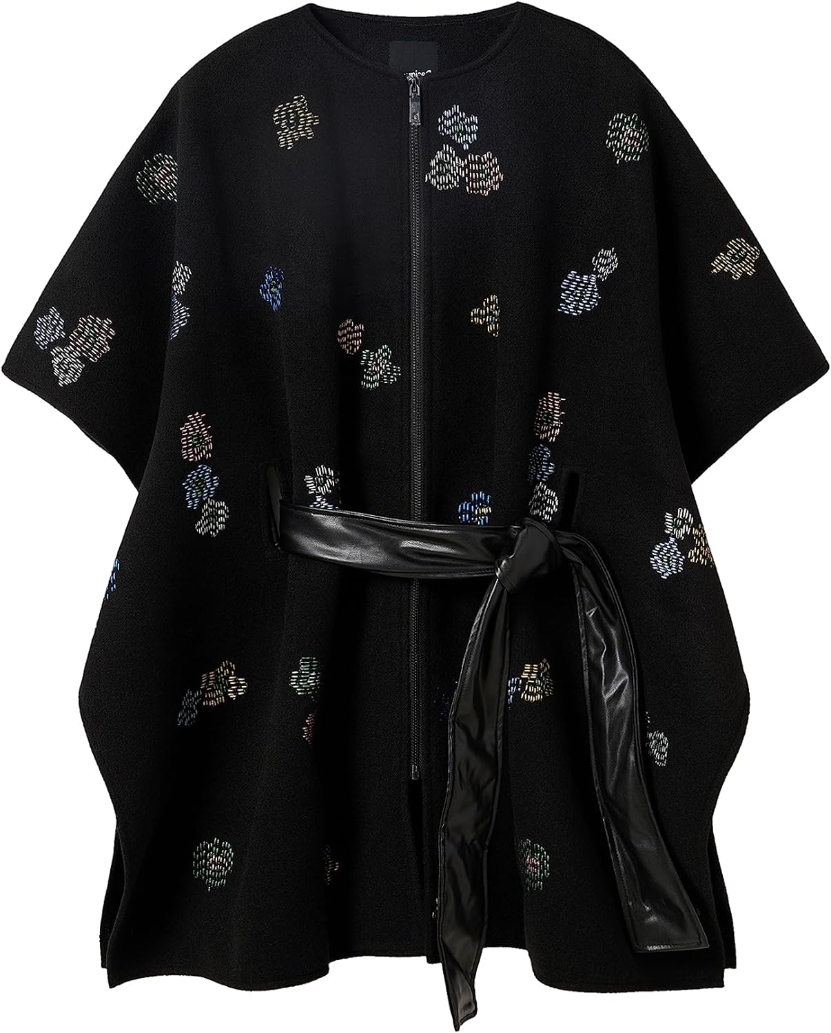 PRODUKTBESCHREIBUNGEN An den Seiten offener Oversize-Poncho mit Gürtel in Lederoptik und Reissverschluss. Tweed-artiger Stoff mit aufgestickten Blumen. Mehr