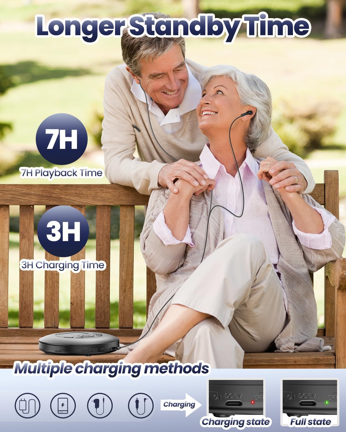 - Tragbar und wiederaufladbar: Der CD Player Tragbar verfügt über einen wiederaufladbaren Akku mit einer Laufzeit von bis zu 7 Stunden. Seine kompakte und tragbare Gerät ist perfekt für on-the-go-Audio. Mini-CD-Player wird sehr freundlich sein, Sie