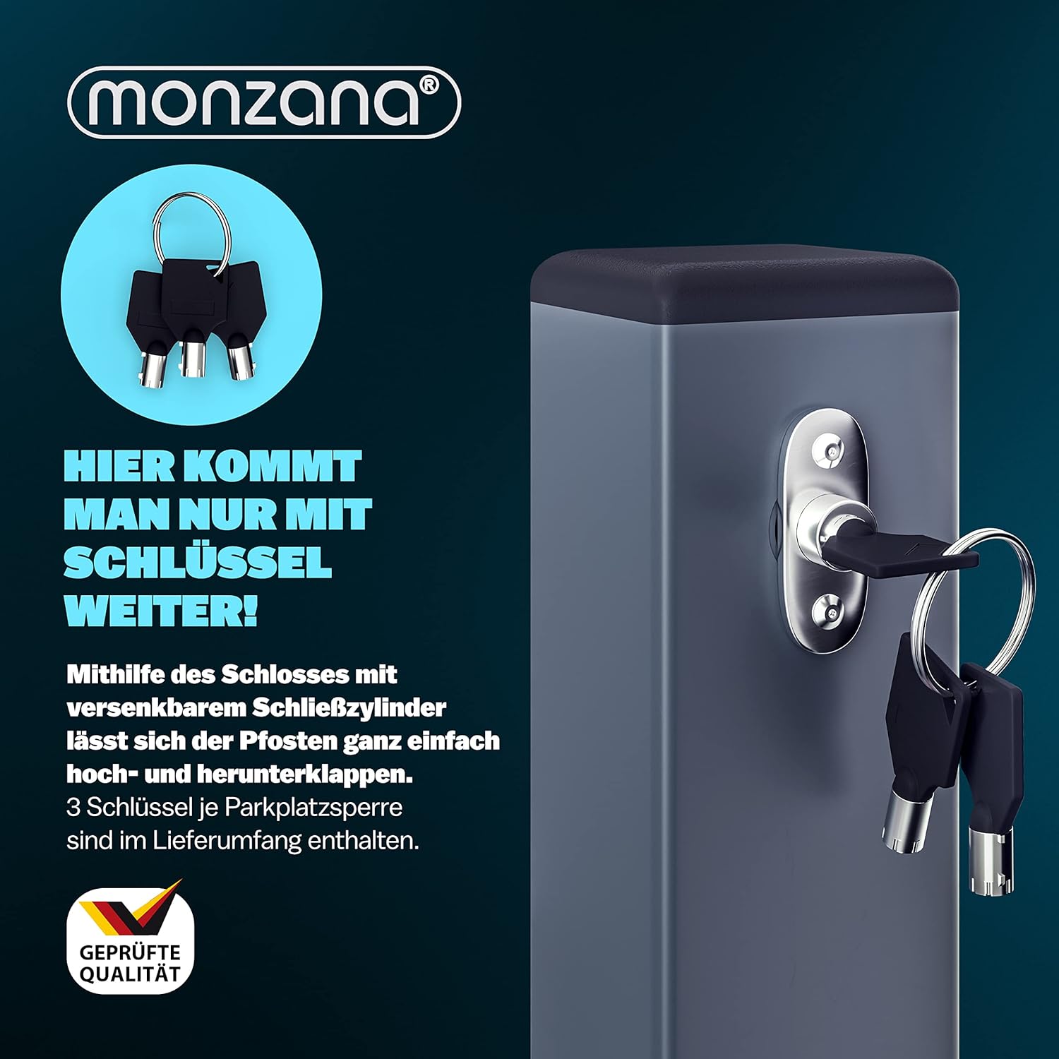 - EINFACHE HANDHABUNG: Über das Schloss mit versenkbarem Schliesszylinder ist die Parkplatzsperre sekundenschnell hoch- bzw. runtergeklappt. Die Höhe im umgeklappten Zustand beträgt nur 7,5 cm. Dadurch sind auch tiefergelegte Fahrzeuge kein Problem.