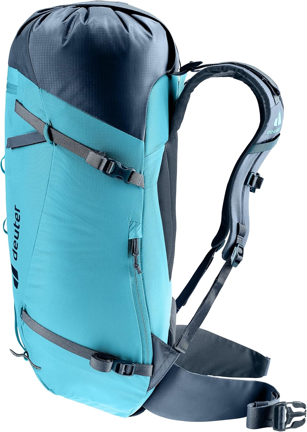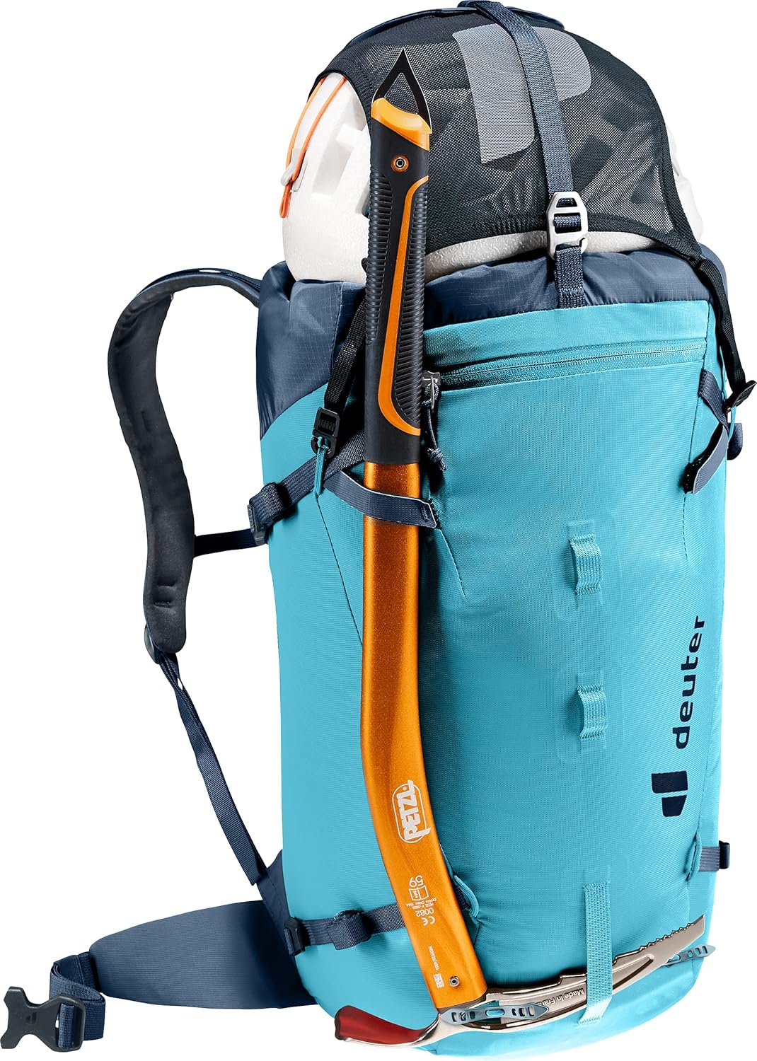PRODUKTBESCHREIBUNGEN Der klimaneutrale, PFC-freie Guide SL überzeugt durch niedriges Gewicht und zuverlässiges Handling. Robuste Materialien, ausgefeilte Befestigungsmöglichkeiten für Pickel und Helm, verstaubare Seilfixierung und Hüftflossen ermöglichen vielseitige anspruchsvolle Einsatzmöglichkeiten des Rucksacks sowie das Tragen eines Klettergurtes. Die Deckelkonstruktion erlaubt einen schnellen Zugriff auf das Hauptfach. Mit dem im Deckel integrierten, abnehmbaren Netz lässt sich der Helm je nach Bedarf entweder oben am Deckel oder an der Rucksackfront befestigen.
