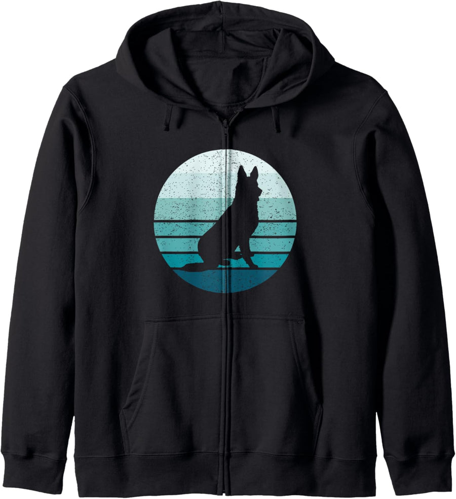 PRODUKTBESCHREIBUNGEN Silhouette des Deutschen Schäferhundes. Ein tolles Geschenk für einen deutschen Schäferhundbesitzer; Retro- und Vintage- und Used-Look. Ein Hund vor einem blau gestreiften Sonnenuntergang Hintergrund.