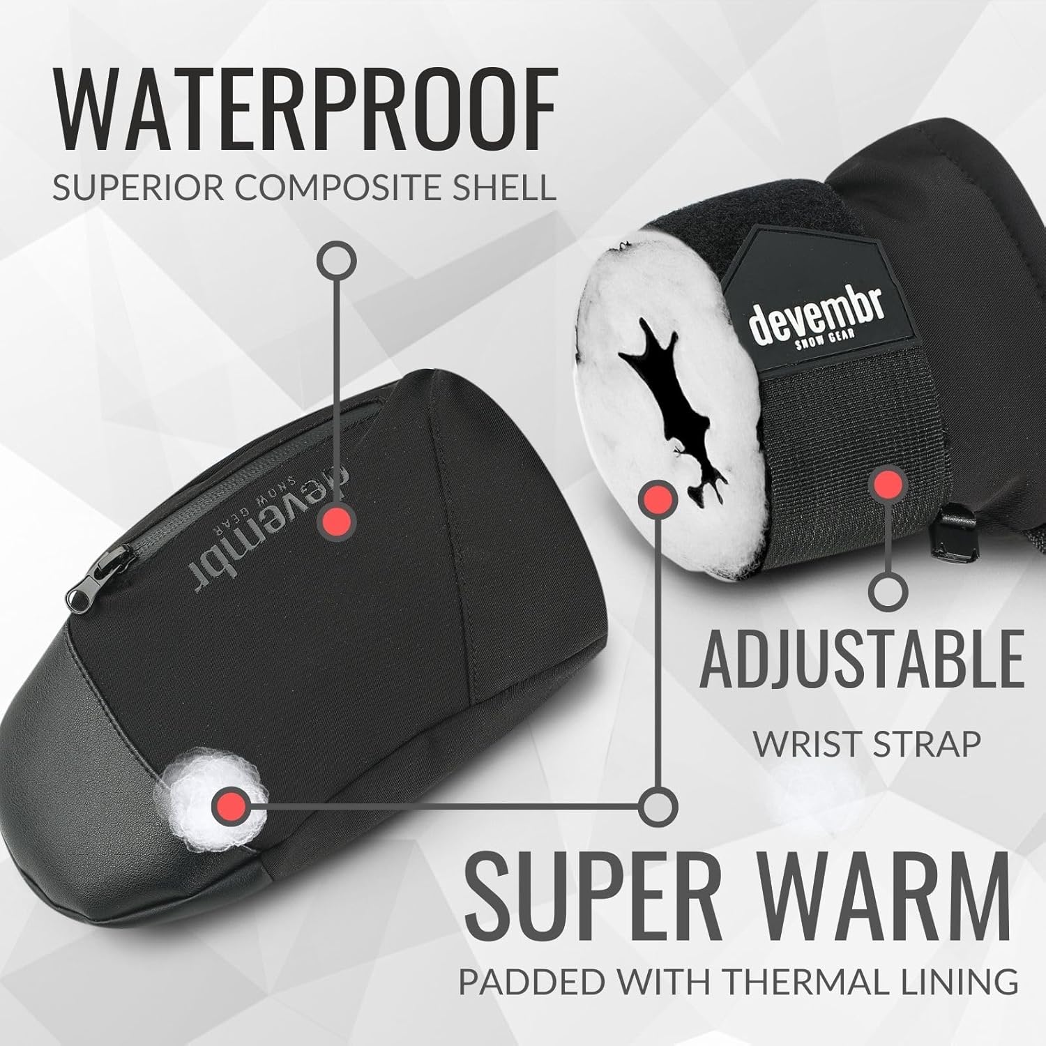 - Handgelenk- und Handflächenschutz: Devembr-Skifäustlinge sind mit einem Paar abnehmbarer Handgelenkschützer ausgestattet und minimieren das Risiko von Handgelenksverletzungen. Die Handfläche ist zum Schutz vor Abrieb und für Langlebigkeit mit