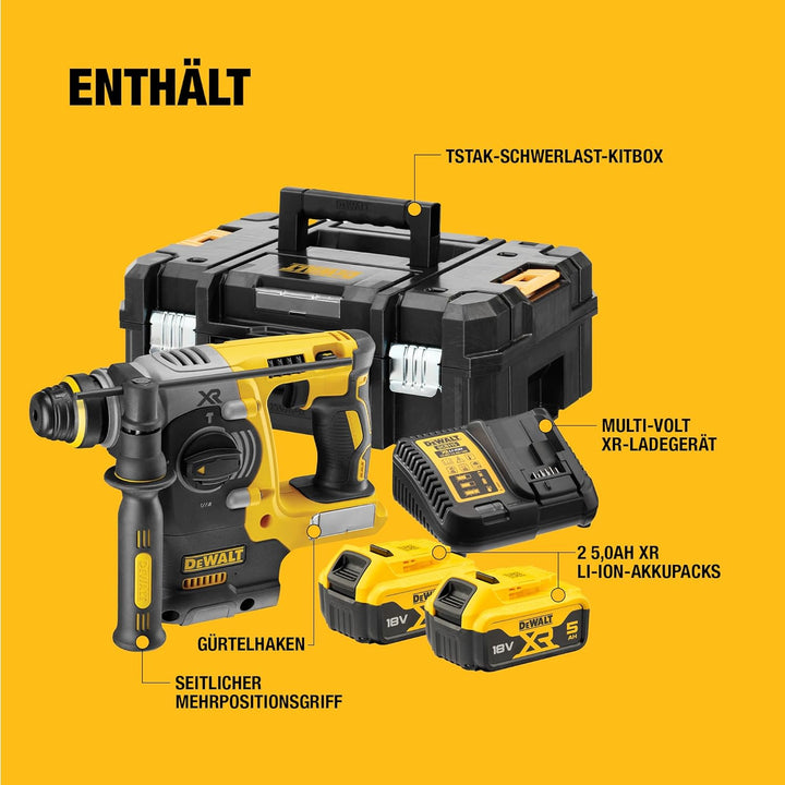 - Lieferumfang: 1x 24 mm 18 Volt Akku-Kombihammer, 1x gummierter Zusatzhandgriff, 1x Bohrtiefenanschlag, 2x 5,0 Ah Li-Ion Akkus mit LED-Kapazitätsanzeige, 1x Ladegerät, 1x T-STAK Box II