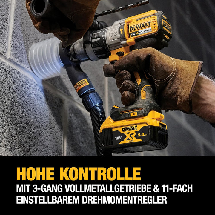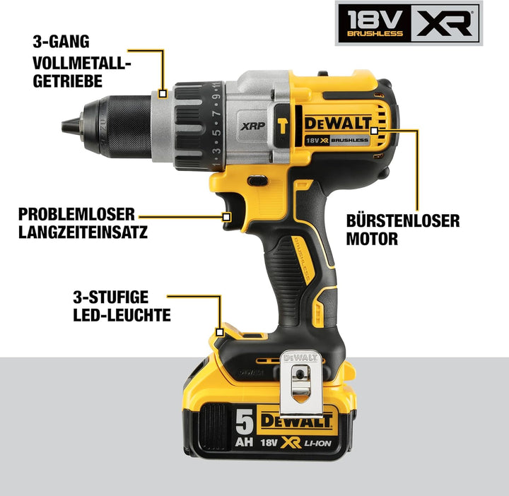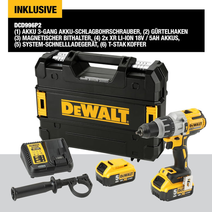 - Lieferumfang: 1x Akku 3-Gang Schlagbohrschrauber, 2 x Li-Ion XR Akkus (5,0 Ah), 1x System-Schnellladegerät, 1x Gürtelhaken, 1x magnetischer Bithalter, 1x verstellbarer Zusatzhandgriff, 1x TSTAK-Box