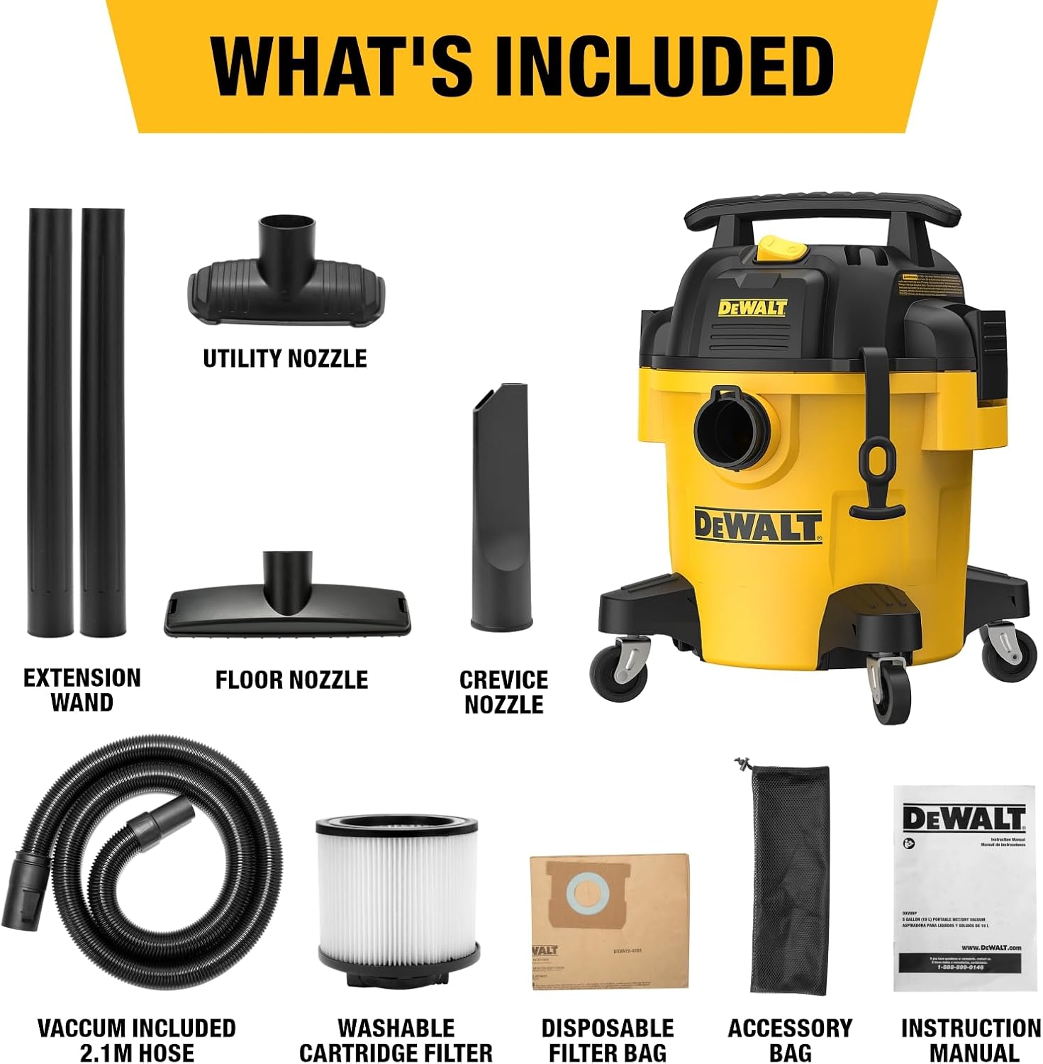 - 【Verpackung und Garantie】 1 x Nass-/Trockensauger, 1 x Schlauch mit 48 mm Durchmesser und 2,1 m Länge, 2 x Verlängerungsstäbe, 1 x Kartuschenfilter, 1 x Staubbeutel, 1 x Bodendüse, 1 x Fugendüse, 1 x Allzweckdüse , 1 x Benutzerhandbuch und