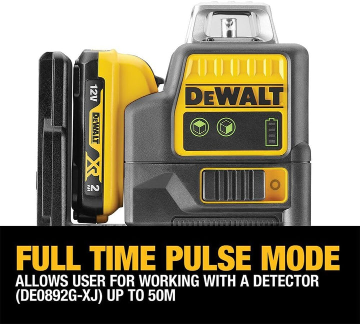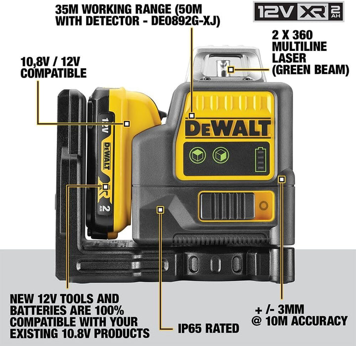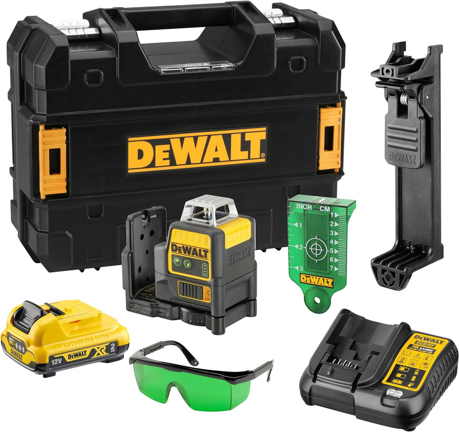 - Lieferumfang: 1x Linienlaser Grün DCE0811D1G, 1x 10,8 Volt/2 Ah Li-Ion XR Akku, 1x Ladegerät, 1x Wandhalterung, 1x Lasersichtbrille, 1x Zieltafel, 1x Transportkoffer