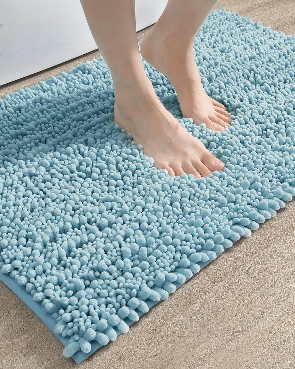 - Pflegeleicht: Schütteln Sie den hellblauen Badezimmerteppich aus, um Schmutz, Ablagerungen und Haare zu entfernen, die sich einschliessen könnten. Der hellblaue Chenille-Teppich ist auch maschinenwaschbar.