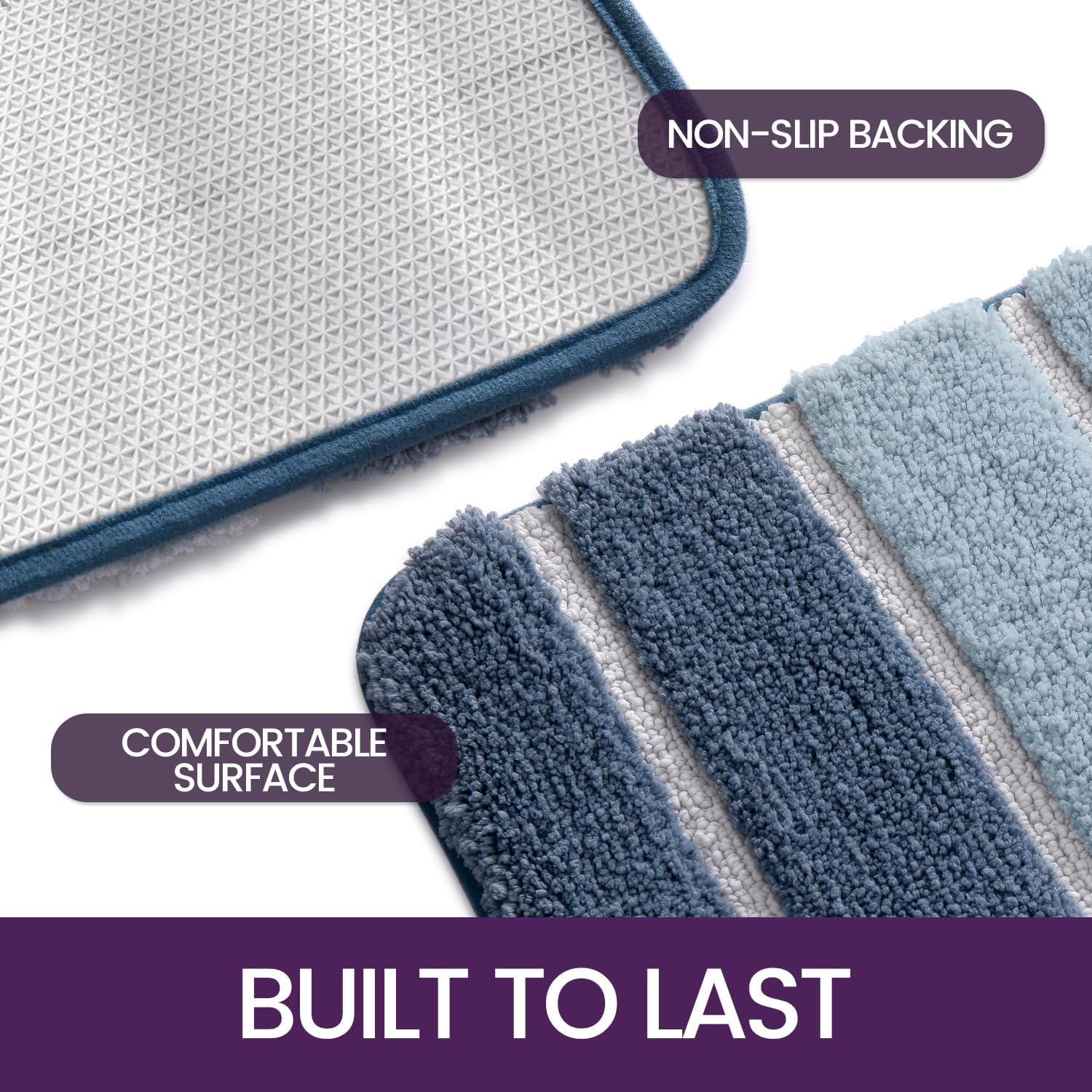 • RUTSCHFESTE UNTERSEITE:Die rutschfeste Unterseite besteht aus TPR-Material.Es hilft,den Badteppich fest an ihrem Platz zu halten,ohne zu verrutschen.Stellen Sie sicher,dass der Boden unter dem Teppich trocken ist,um ein Verrutschen zu verhindern.