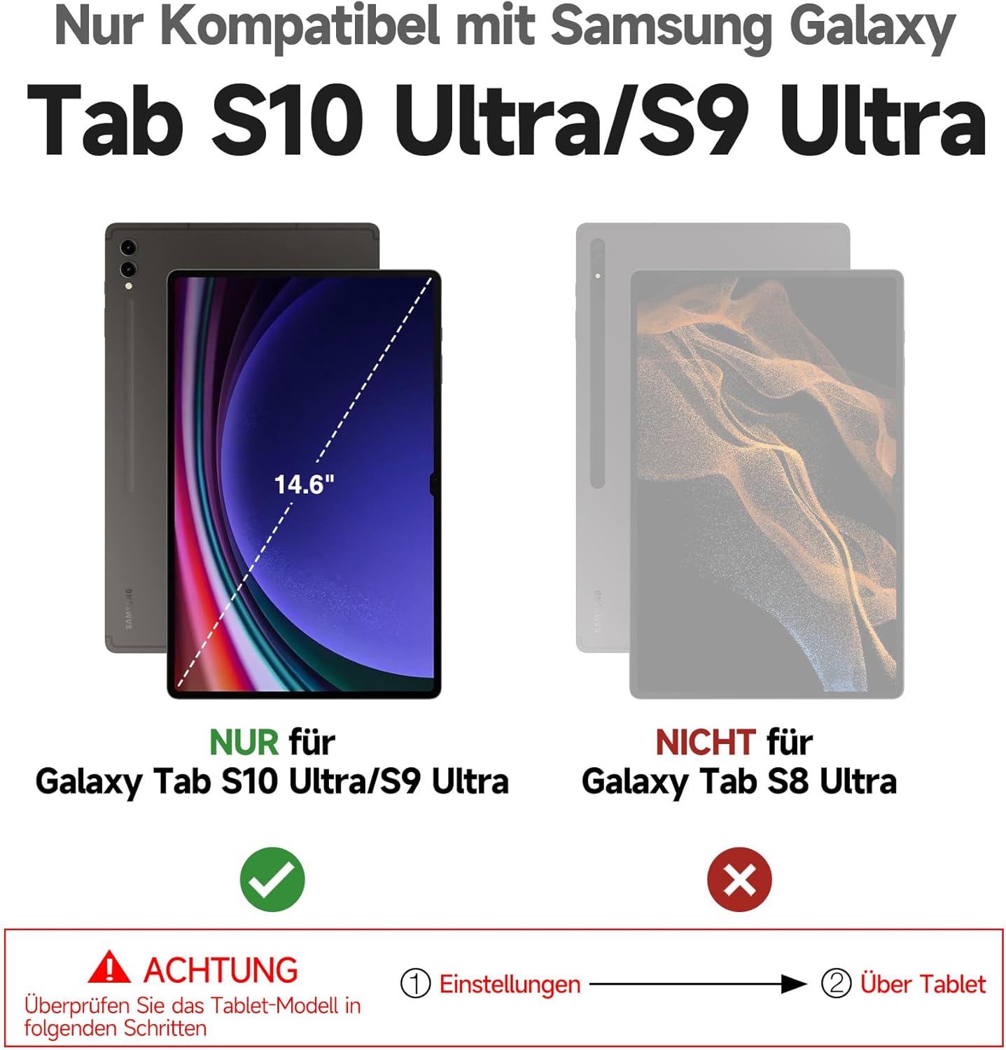 - Kompatibilität: Die Tablet-Hülle mit Tastatur ist NUR mit dem Samsung Galaxy Tab S10 Ultra 14,6 Zoll (Modell SM-X920/SM-X926B) 2024 Release, Samsung Galaxy Tab S9 Ultra 14,6 Zoll (Modell SM-X910/SM-X916B) 2023 Release kompatibel. Hinweis: Das Tablet