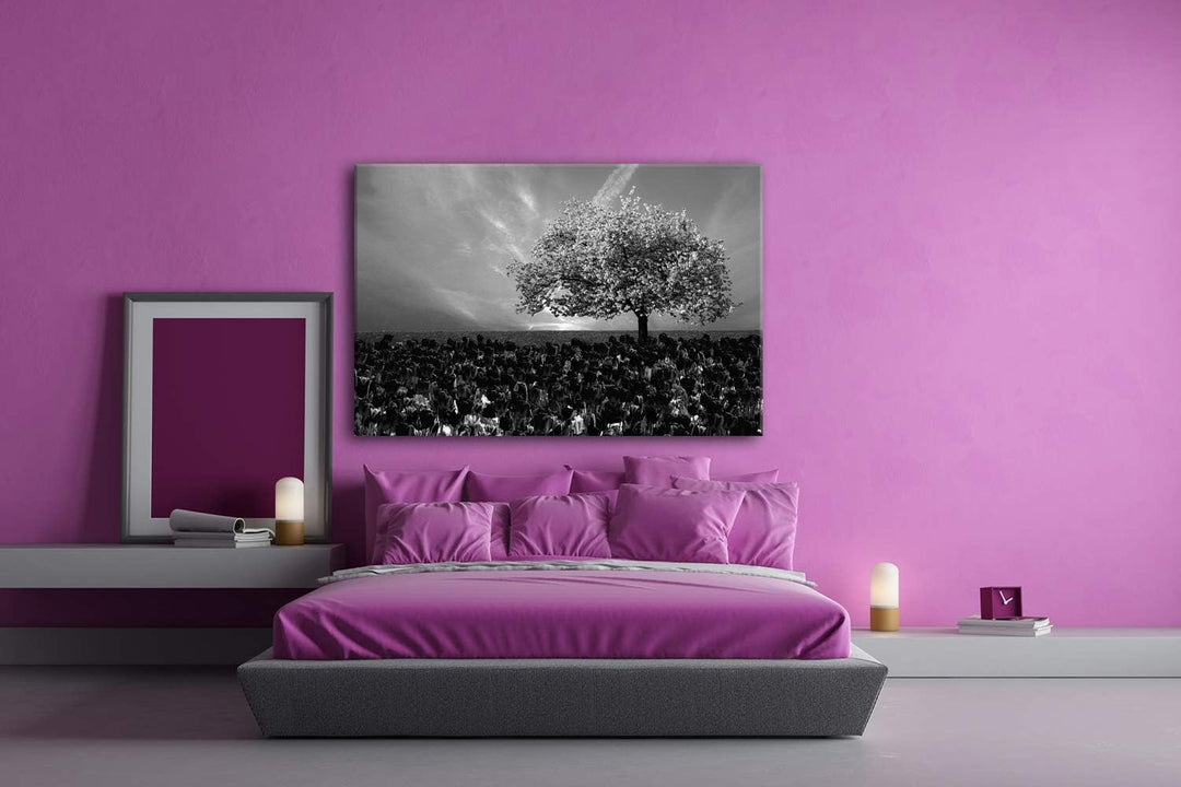 deyoli Kirschbaum im Tulpen Feld Format: 80x60 Effekt: Schwarz&Weiss als Leinwandbild, Motiv fertig