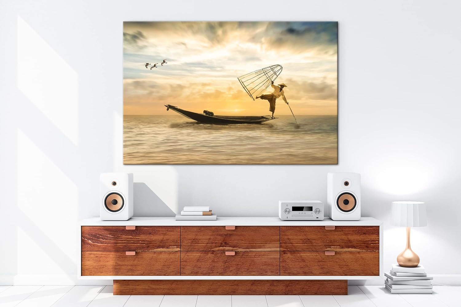 deyoli verspielter Fischer auf seinem Boot Format: 120x80 als Leinwandbild, Motiv fertig gerahmt auf