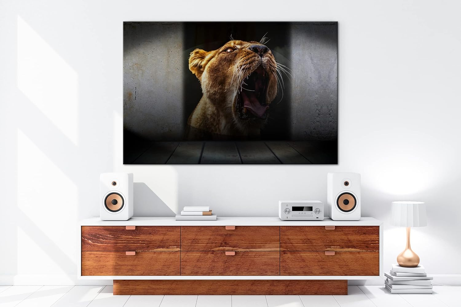 deyoli brüllende Löwin Format: 80x60 als Leinwand, Motiv fertig gerahmt auf Echtholzrahmen, Hochwert