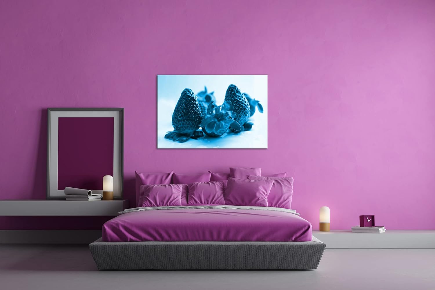deyoli Knallrote Erdbeeren Format 80x60 Effekt: Monocrome Blau als Leinwandbild, Motiv fertig gerahm
