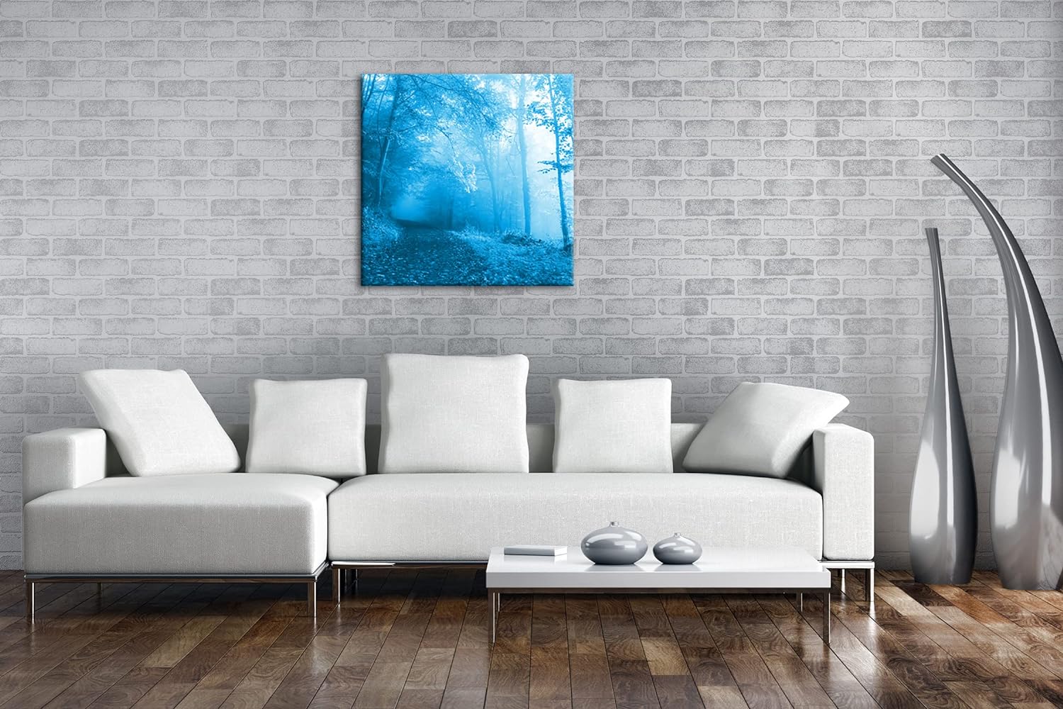 deyoli vernebelter Waldweg im Herbst Format: 70x70 Effekt: Monocrome Blau als Leinwandbild, Motiv fe
