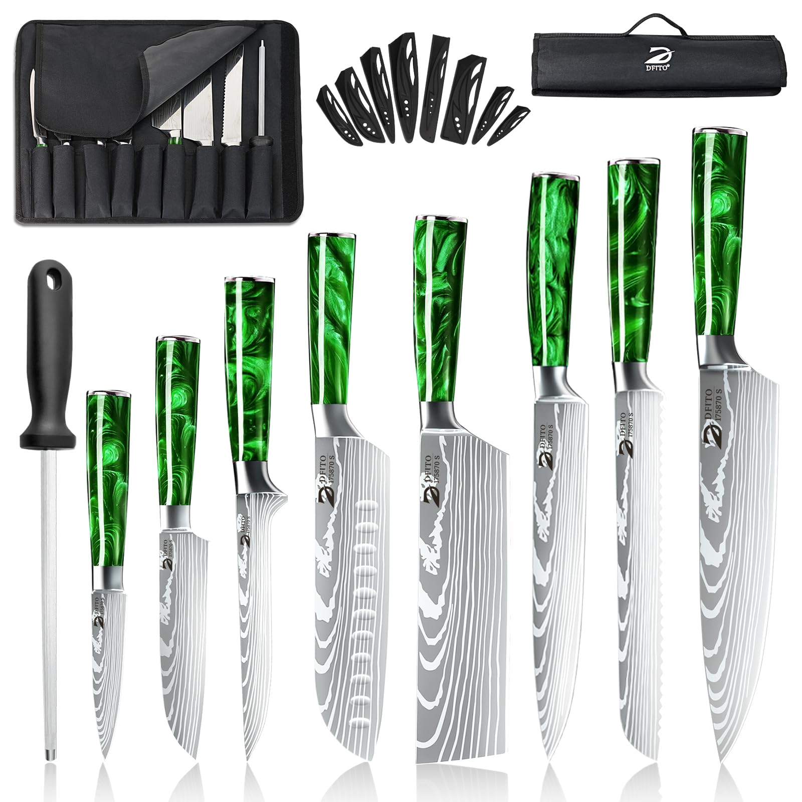 - Messerset mit Rolltasche:Dieses Dfito Messerset kommt mit Messerscheide und Nylon Roll Tragetasche, die Scheide wird verwendet, um Ihre Messerklinge und Finger zu schützen, und die Messerrolle Tragetasche ist ein guter Aufbewahrungsorganisator für