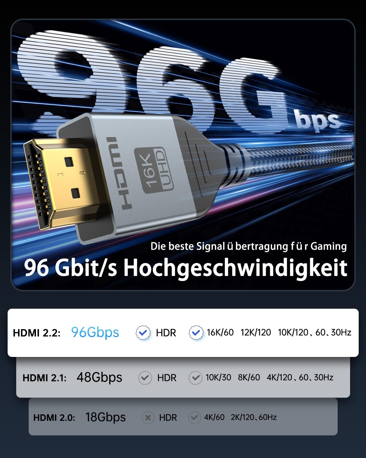 - Neueste HDMI-Technologie 16K: HDMI-Kabel mit HDMI 2.2 Standard, Signalübertragung ohne Latenz. Das HDMI-Kabel unterstützt die beste Auflösung von 16 K, es kann die Auflösung und die Bildrate von 16 K bei 60 Hz, 12K bei 120 Hz, 8 K bei 240 Hz 4 K @