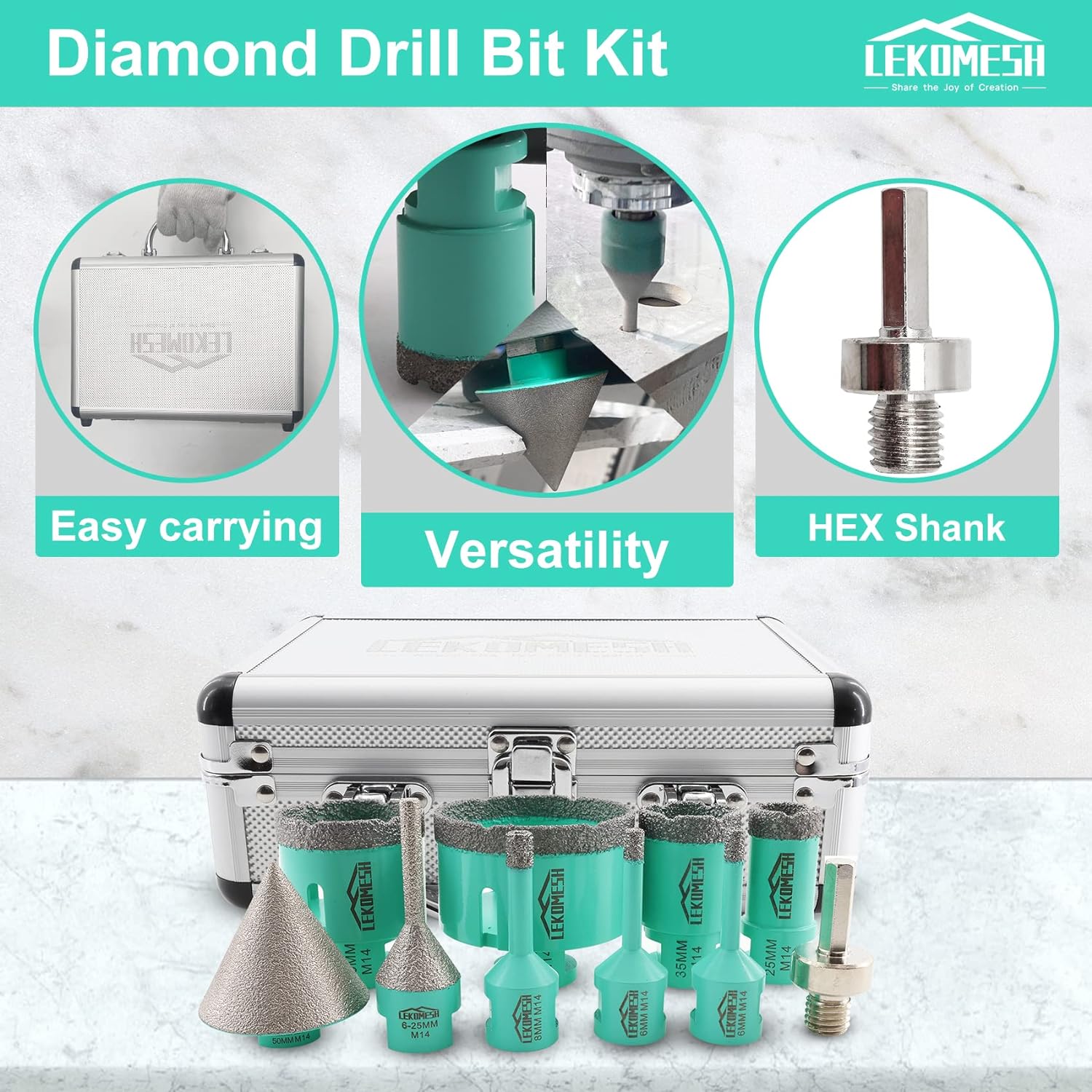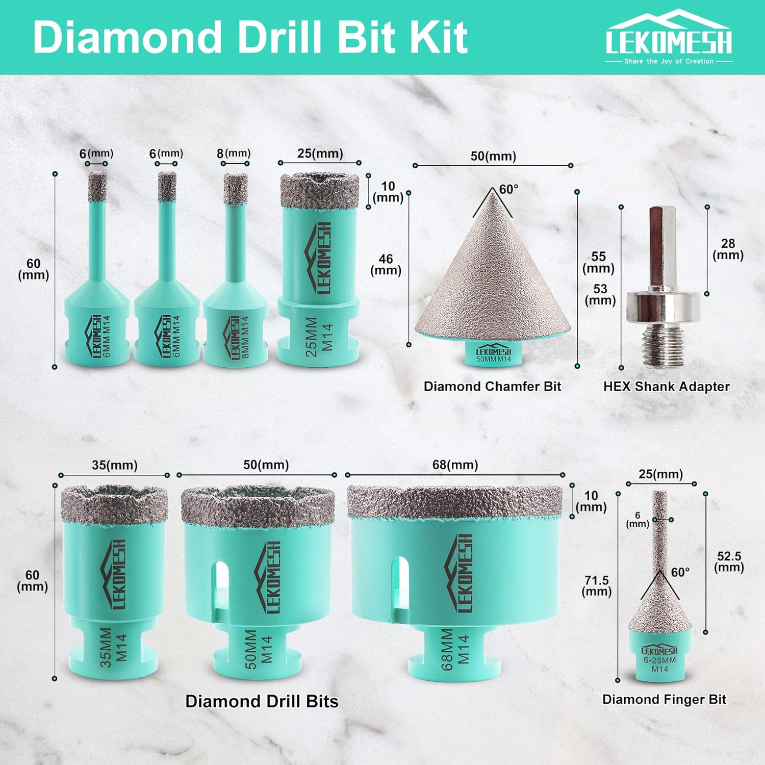 - 【PACKAGE INHALTEN】10pcs/box: 7pcs Bohrer: Durchmesser (6/6/8/25/35/50/68mm), Diamanthöhe 10mm, Diamantkörnung: #35/40; 1pc Fasenfräser Bits (6-25mm), 1pc 50mm Diamant Fasenfräser, Arbeitstiefe: 20mm, Diamantkörnung: #80/100; 1pc HEX Schaft