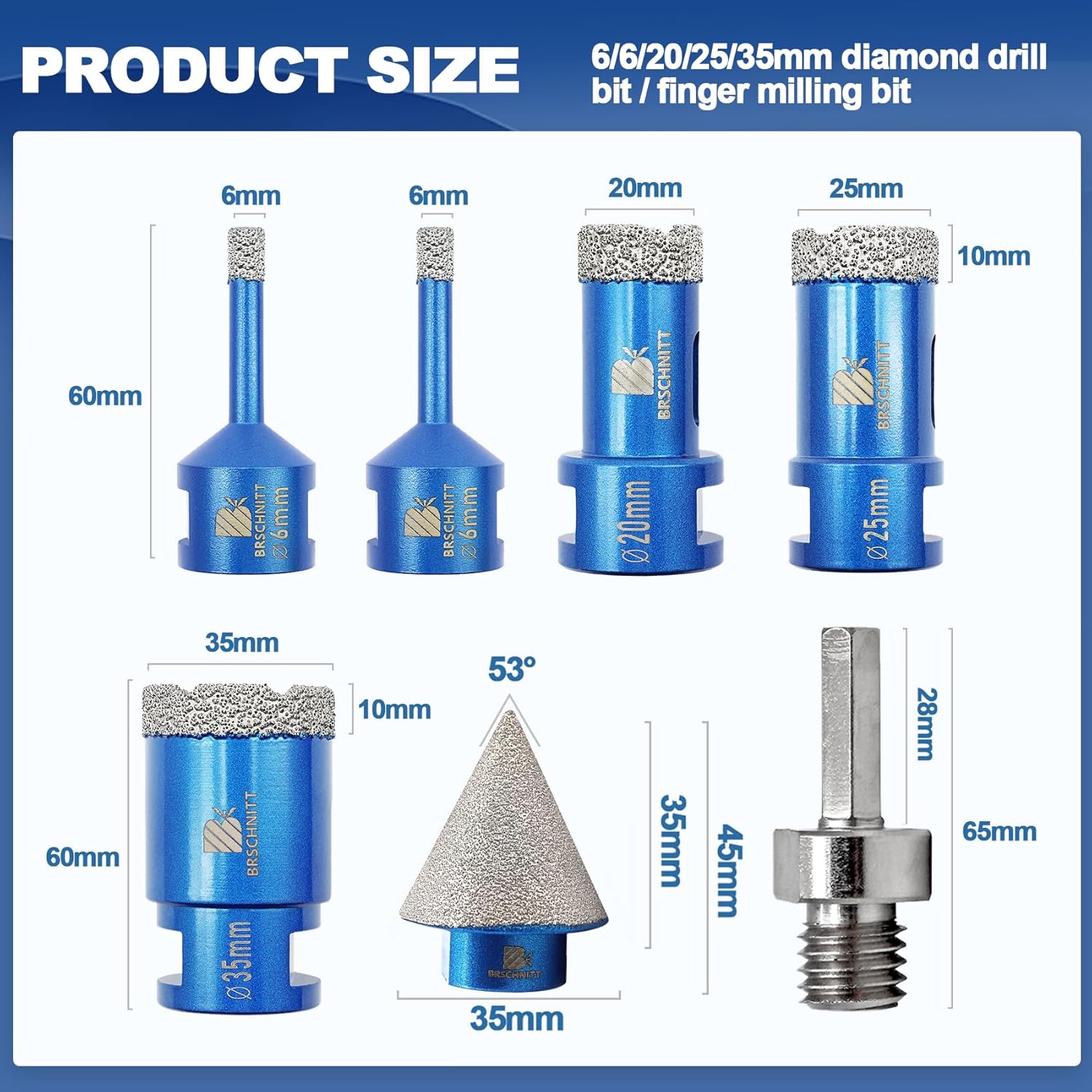 - ✔ Grösse Diamantbohrer: 6/6/20/35 mm, Diamant-Höhe 10 mm, Gesamtlänge 60 mm, M14-Gewinde. Sechskantschaftadapter.