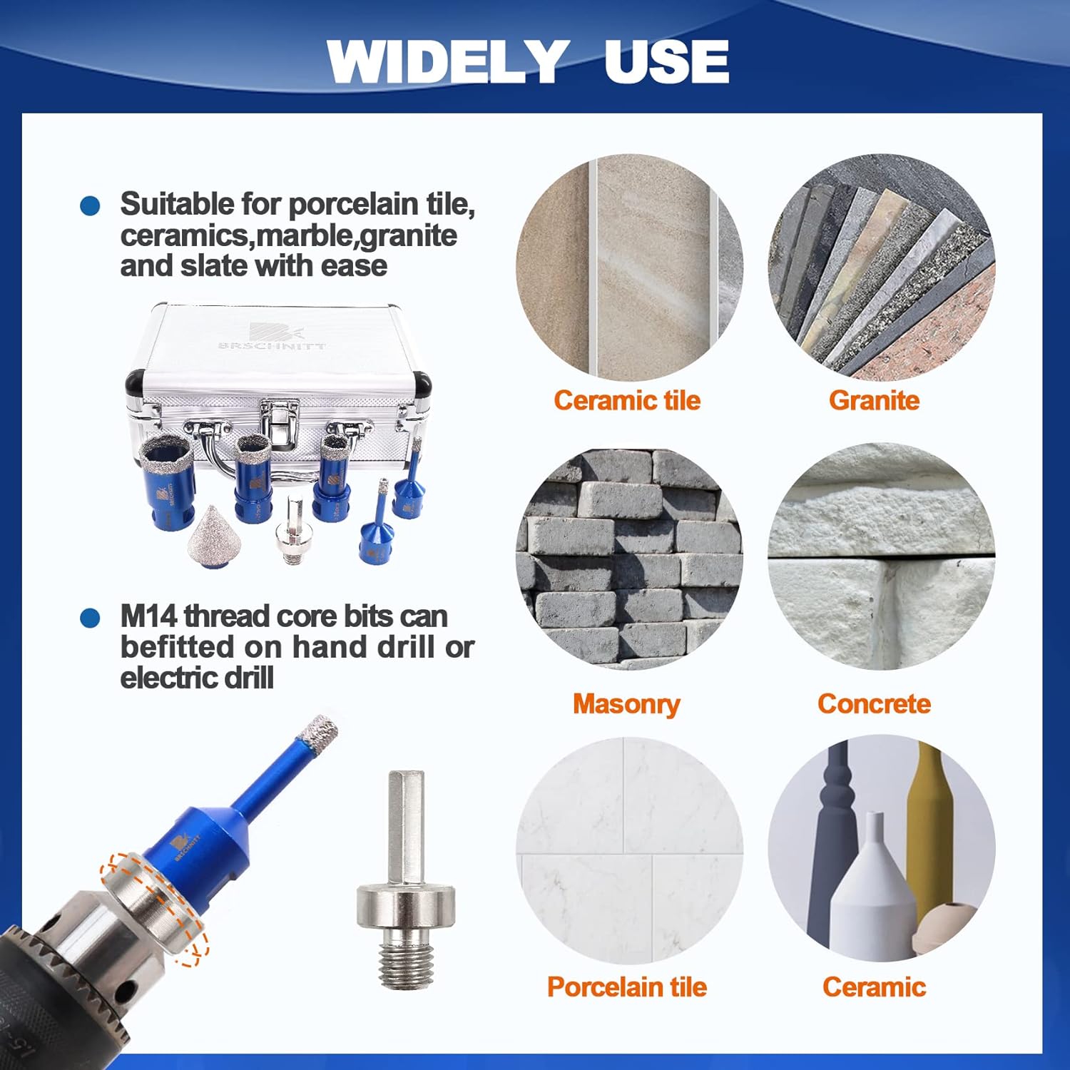- ✔ Breite Anwendung des Bohrers – Ideal für Porzellanfliesen, Keramik, Badezimmerfliesen, Marmor, Granit, Stein, Mauerwerk, Ziegel. Mit Wasser kann die Lebensdauer verlängern