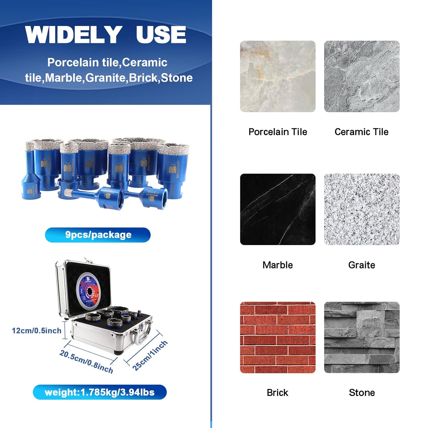 • ✔Wide Application of drill bit --Worked great for porcelain tile, ceramics, bathroom tile,marble granite,stone,masonry, brick with ease,Using water could prolong the lifetime