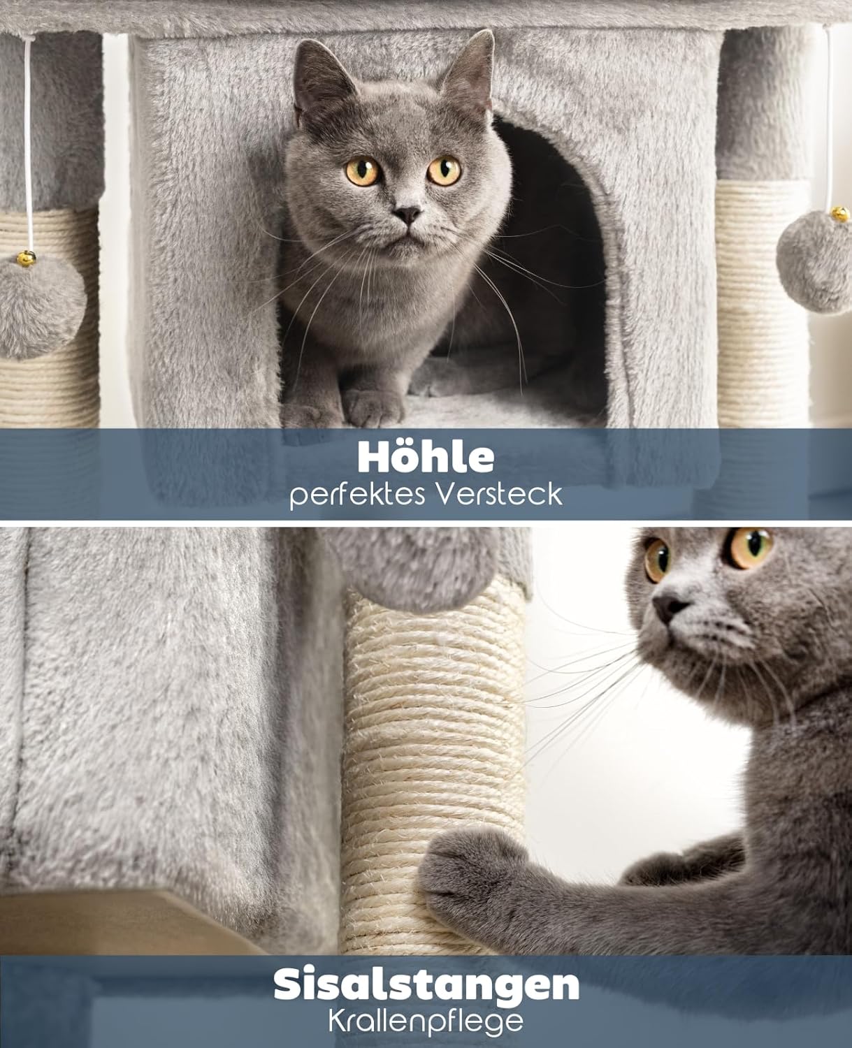 • IDEALES SPIEL- UND RUHEPARADIES. Die Ausstattung dieses Katzenbaumes mit Höhle und 2 Plüschbällen mit Glöckchen befriedigt den Spieltrieb Ihrer Katze. Das gemütliche Liegebett unterstützt die benötigten Ruhephasen und auch das beliebte Beobachten