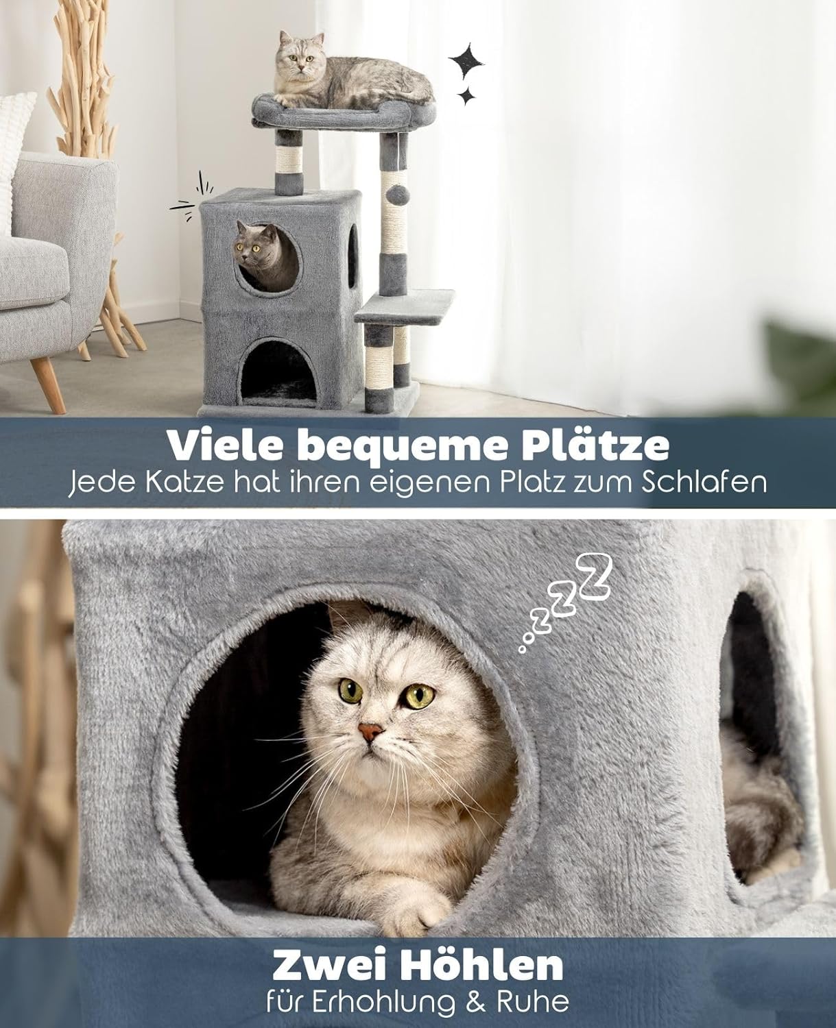 - IDEALES SPIEL- UND RUHEPARADIES. Die vortreffliche Ausstattung dieses Katzenbaumes mit 2 Höhlen und einem Plüschball mit Glocke befriedigt den Spieltrieb Ihrer Katze. Das gemütliche Liegebett unterstützt zusätzlich die benötigten Ruhephasen und